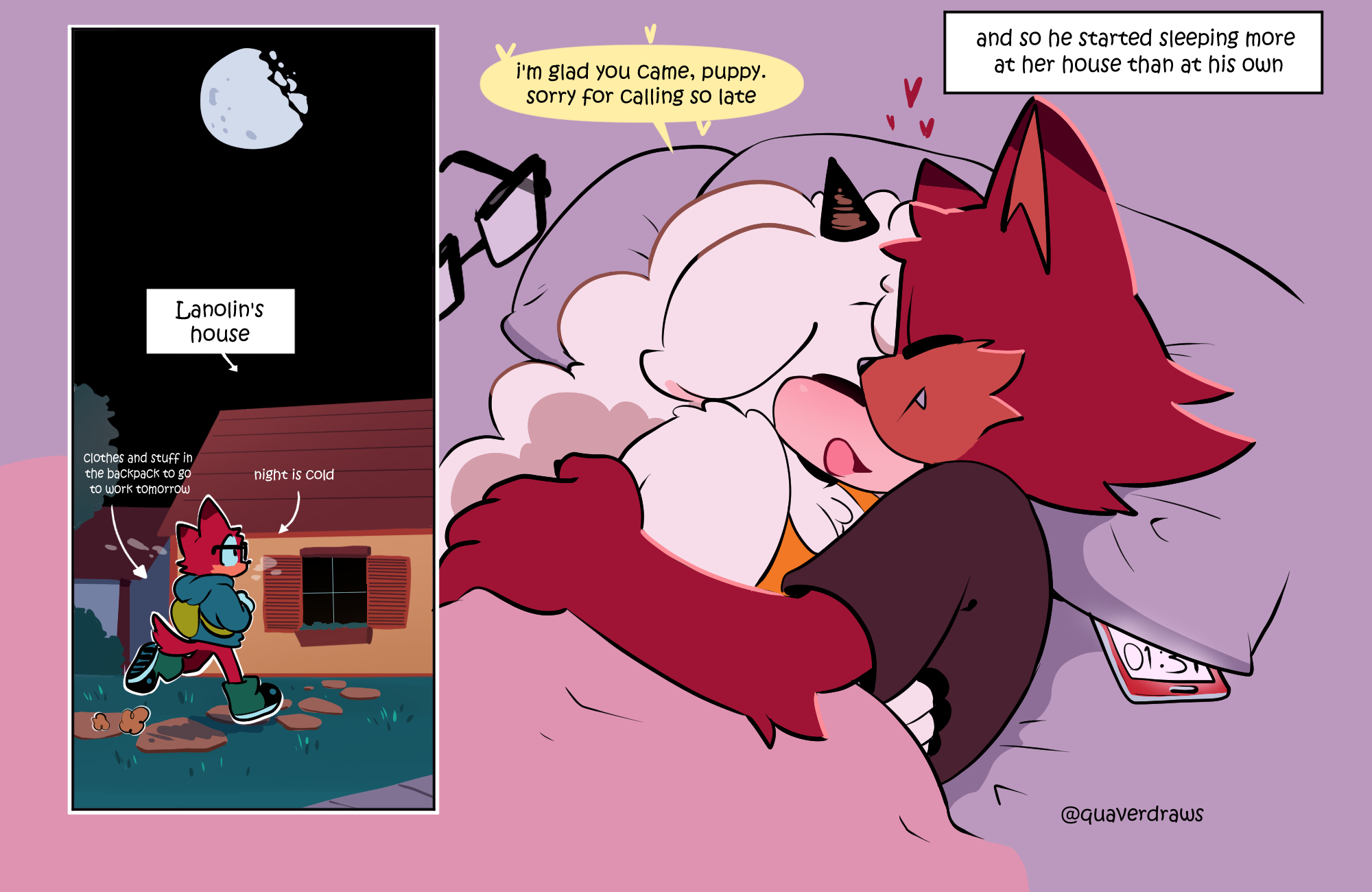 safe37615 artist:quaverdraws26 gadget the wolf245 lanolin the sheep176 sheep70 wolf439 20253745 alternate outfit1205 bag161 bed306 bedroom30 blanket60 carrying something9 clothes1734 comic770 dialogue2658 duo12429 english text4310 female6326 gadget x lanolin24 glasses432 heart3235 hoodie310 house23 lying down522 male6690 moon204 nighttime516 pants532 phone137 pillow158 running628 shipping9925 shirt753 sleeping429 speech bubble1482 straight1494