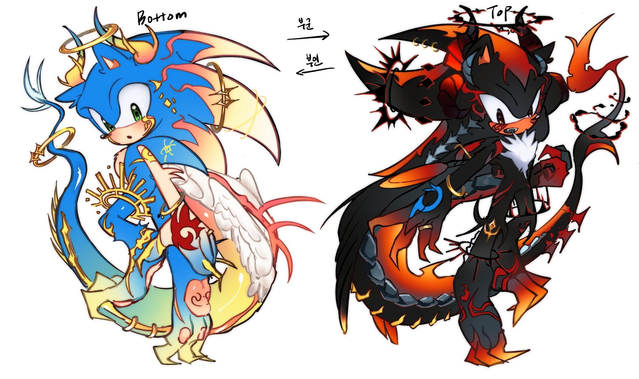 safe37784 artist:tamjeong_sonic353 shadow the hedgehog6372 sonic the hedgehog13789 20253815 alternate universe875 arrow38 duo12535 english text4340 gay5210 halo31 horns22 korean text280 shadow x sonic1784 shadow's logo64 shipping10008 simple background15607 white background7687 wings131