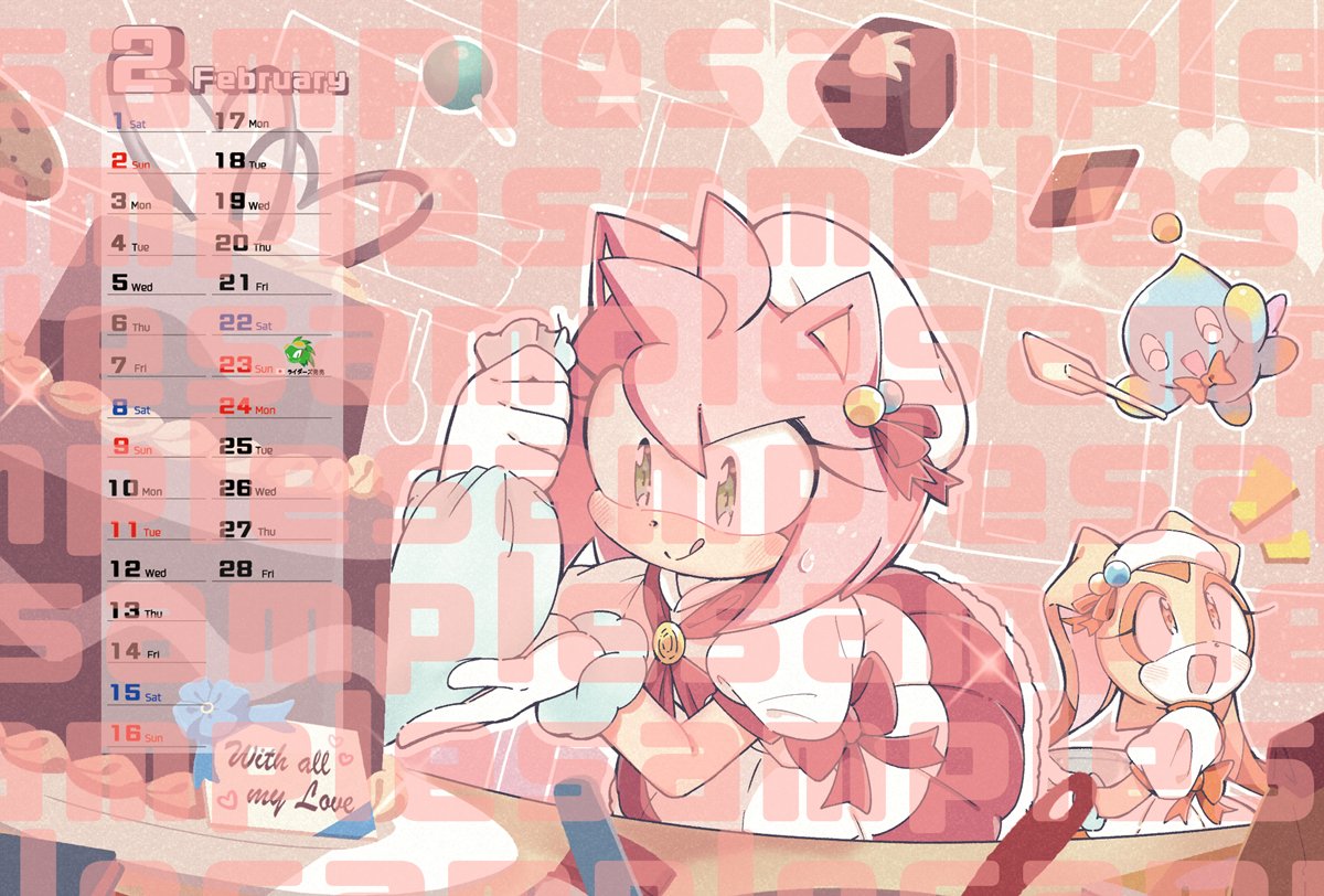 safe38245 artist:posojo1234 amy rose5886 cheese (chao)381 cream the rabbit1095 chao780 series:sonic fan calendar 202513 20244513 alternate outfit1294 cake95 cooking23 eyes closed4814 food501 heart3302 holding something3708 mouth open5923 neutral chao383 obtrusive watermark207 smile14496 star (symbol)788 trio1834 valentine's day132 watermark587