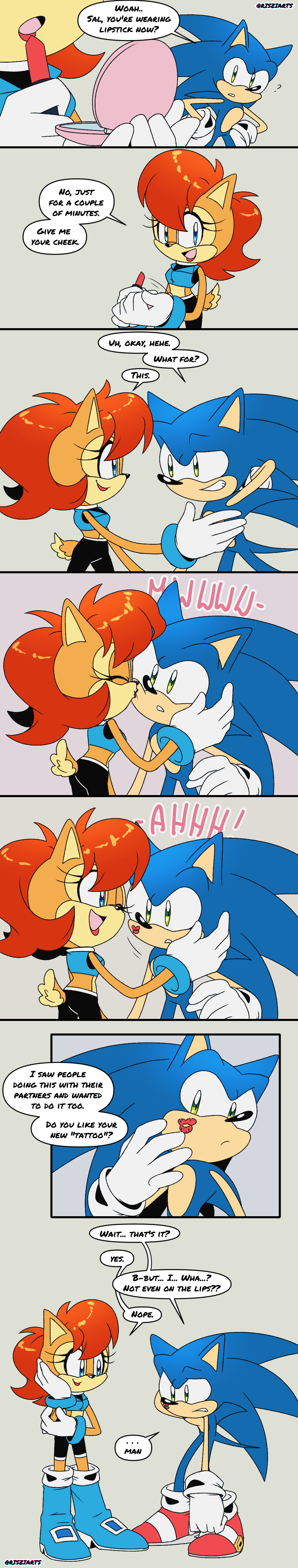 safe38692 artist:risziarts151 sally acorn1553 sonic the hedgehog14220 chipmunk934 hedgehog7850 20232681 comic860 dialogue2752 duo13045 english text4506 female6964 holding something3815 kiss1132 kiss marks22 lipstick55 makeup47 male7134 mirror27 sally x sonic507 sally's ringblader outfit305 shipping10359 simple background16176 speech bubble1636 straight1760