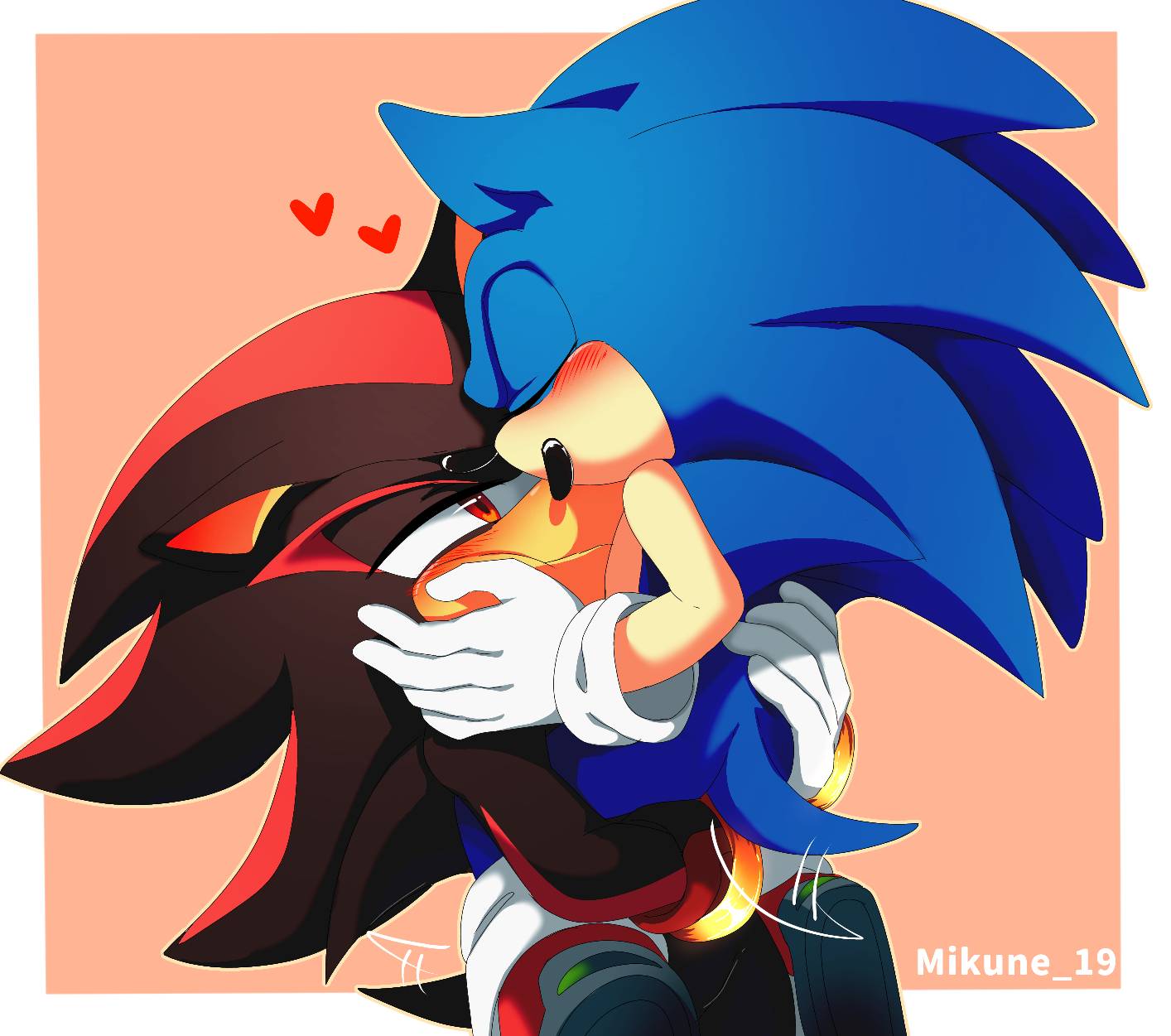 safe38733 artist:mikune_1910 shadow the hedgehog6568 sonic the hedgehog14237 20221501 blushing6852 border592 duo13064 eyes closed4876 frown4836 gay5326 heart3376 holding each other1115 hugging1317 kiss1133 kiss on head81 shadow x sonic1847 shipping10368 signature6254 treads258 wagging tail408