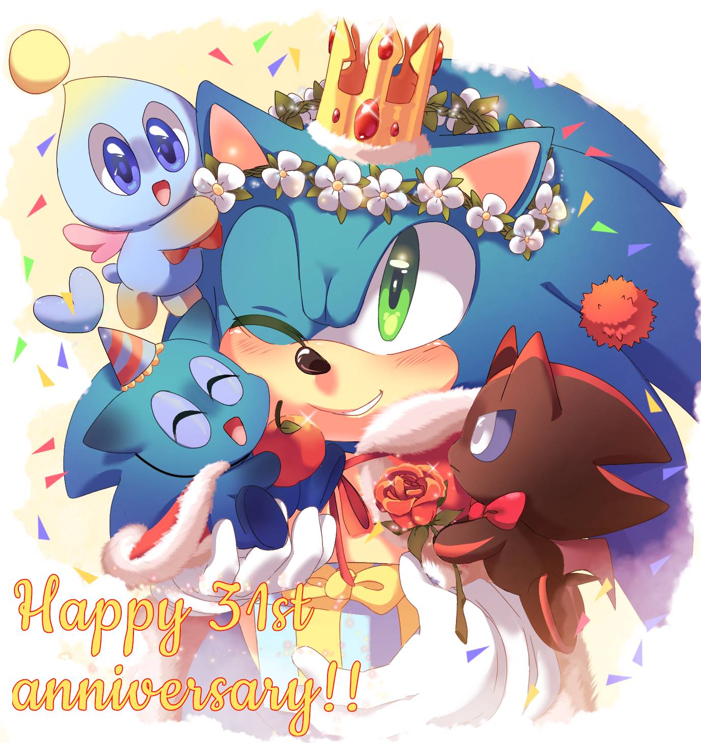 safe38733 artist:mikune_1910 sonic the hedgehog14237 chao783 20221501 apple44 birthday113 blushing6852 cape319 carrying them808 character chao82 crown105 english text4513 eyes closed4876 flower686 flower crown74 flying1295 food514 fruit82 group1444 hat474 heart3376 holding something3821 holding them1037 looking offscreen4517 mid-air830 neutral chao384 one eye closed763 party hat26 present57 rose130 shadow chao40 smile14828 sonic chao42 text840