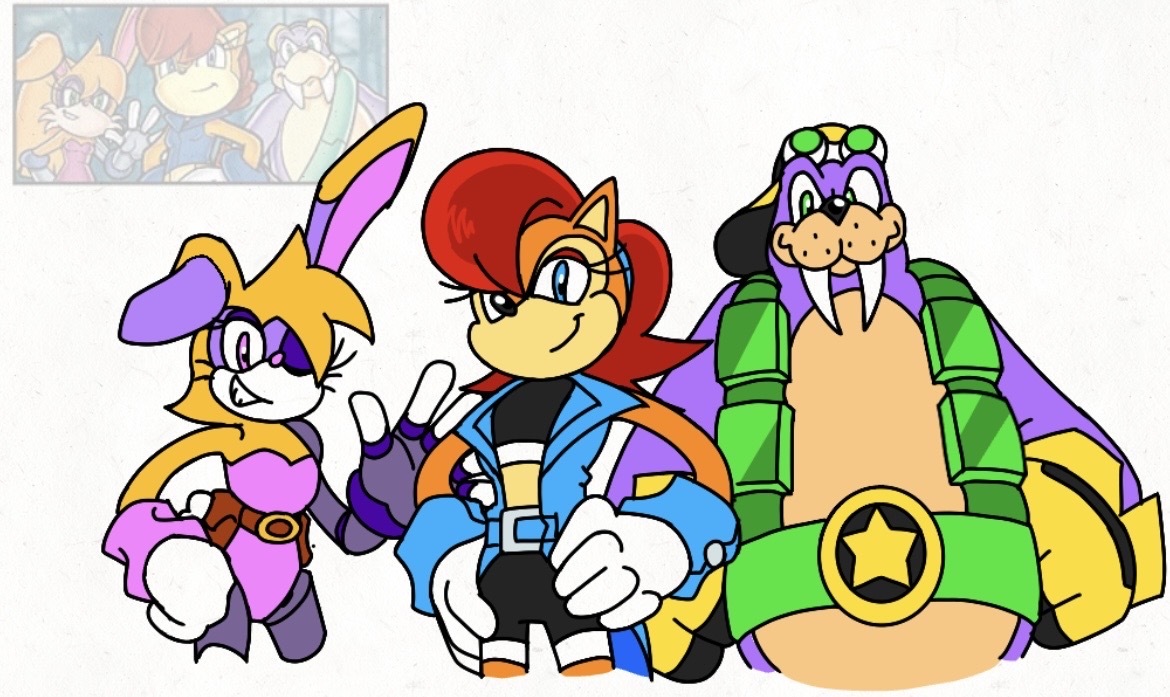 safe38899 artist:calebartboy1516 bunnie rabbot332 rotor walrus90 sally acorn1584 20254126 belt445 clothes1896 eyelashes1220 fur markings251 gilet26 goggles860 goggles on head386 hand on hip1045 hands on hips218 hat478 redraw1412 reference inset547 simple background16298 smile14927 standing11337 trio1884 waving361 white background8018 wink1202