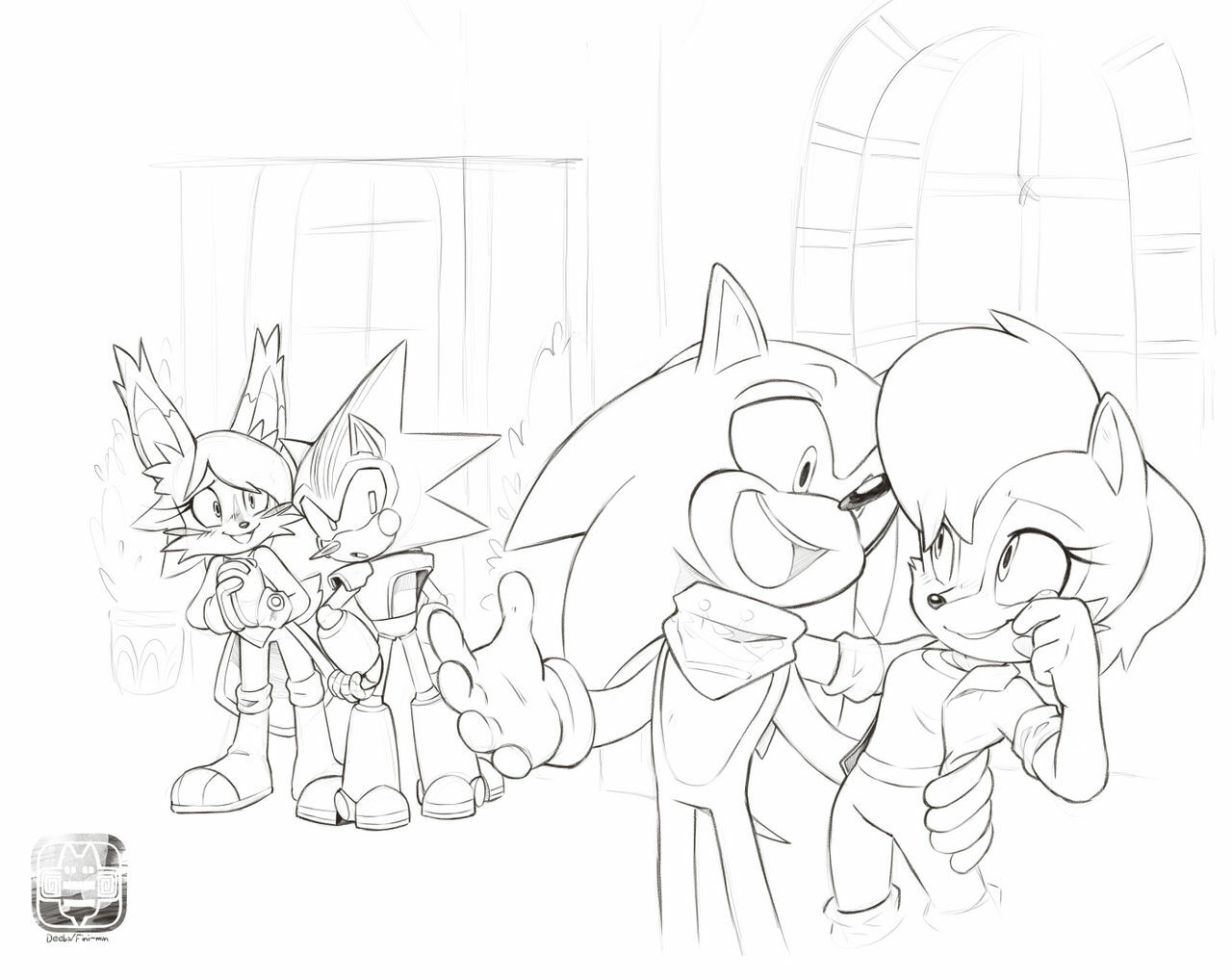 safe39065 artist:finimun54 nicole the hololynx383 sally acorn1601 shard the metal80 sonic the hedgehog14368 chipmunk977 hedgehog7973 lynx147 2018661 clothes1929 female7036 holding them1064 looking at each other2906 looking at them2354 male7182 nicole x shard36 quartet101 robot1123 sally x sonic533 scarf591 shipping10517 straight1839
