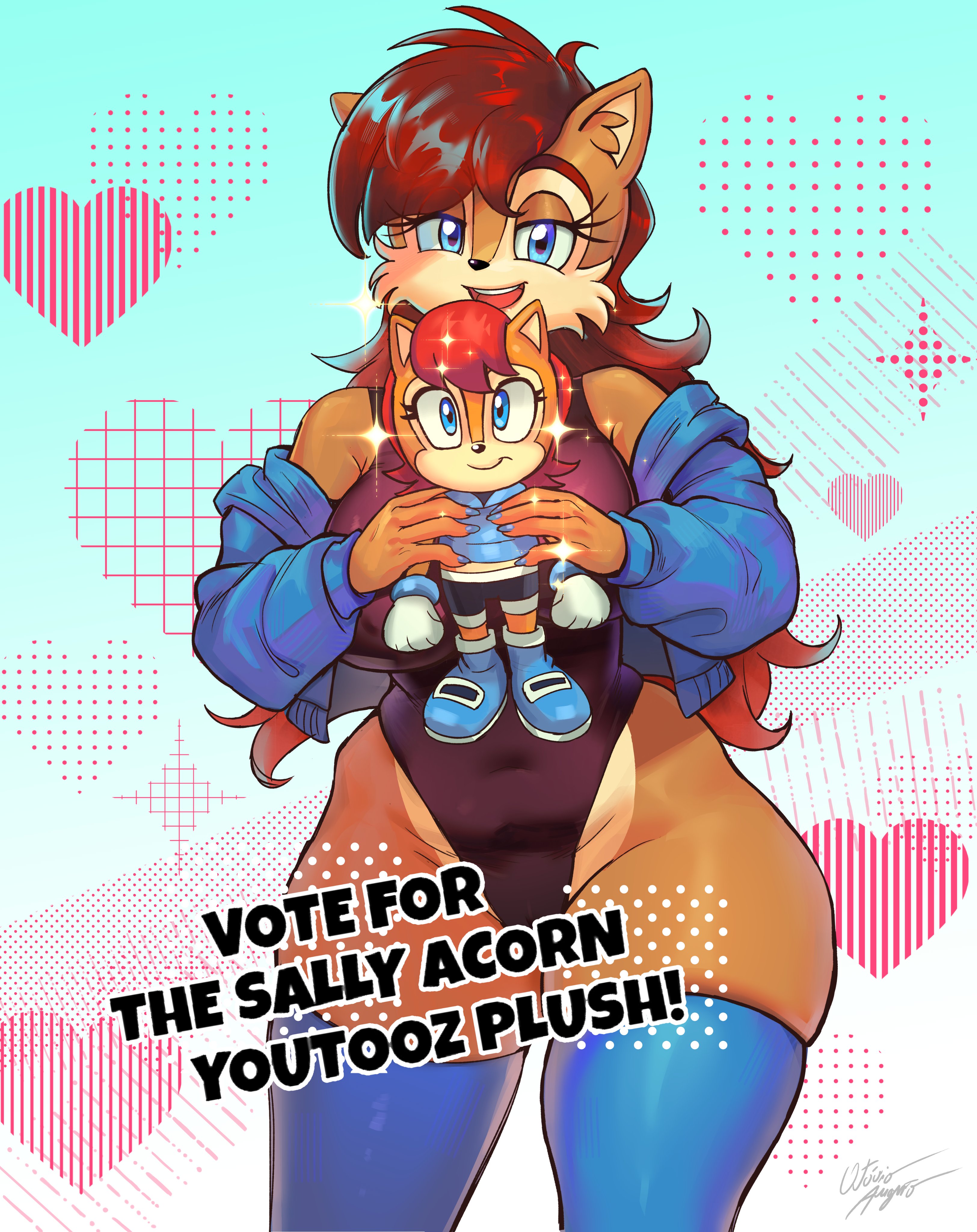 safe39065 artist:azul35art9 sally acorn1601 chipmunk977 2026625 alternate outfit1391 busty sally49 clothes1929 english text4573 female7036 heart3428 holding something3899 jacket1116 looking at viewer8816 plush9 sally's ringblader outfit321 solo17916 sparkles1079 youtooz2