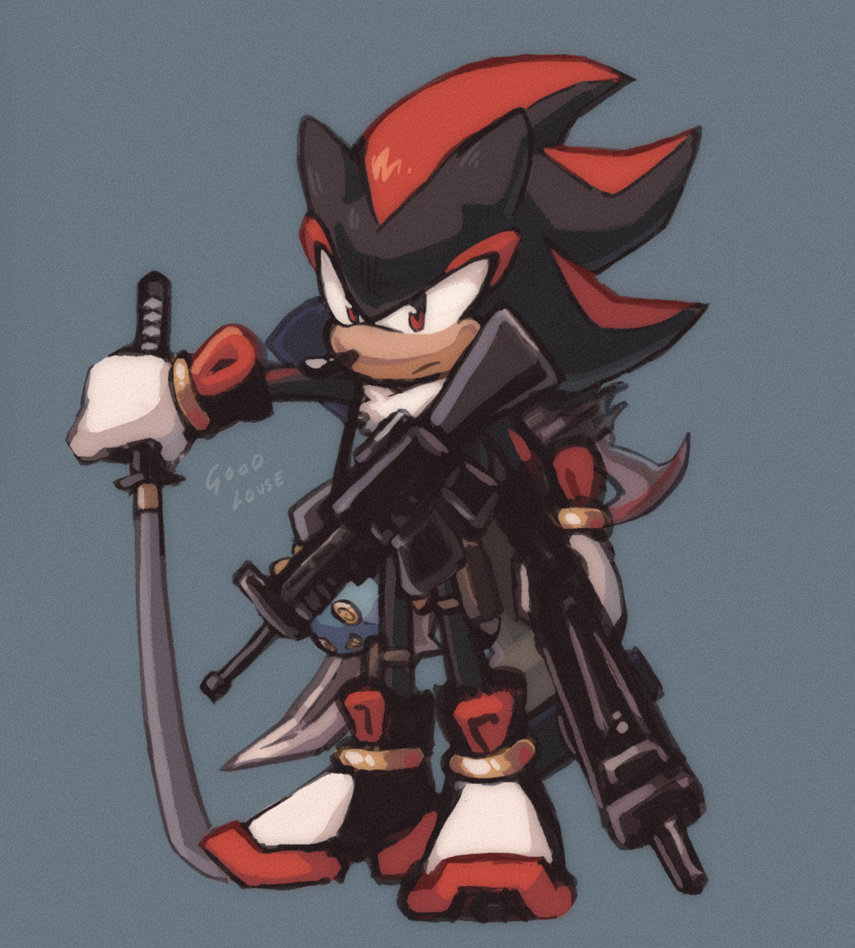 safe39674 artist:goodlouse2 shadow the hedgehog6753 hedgehog8309 20254259 blue background751 frown5062 gun366 holding something4075 katana19 looking offscreen4760 male7556 omochao gun2 rifle4 shadow the hedgehog (video game)149 signature6429 simple background16865 solo18339 weapon216