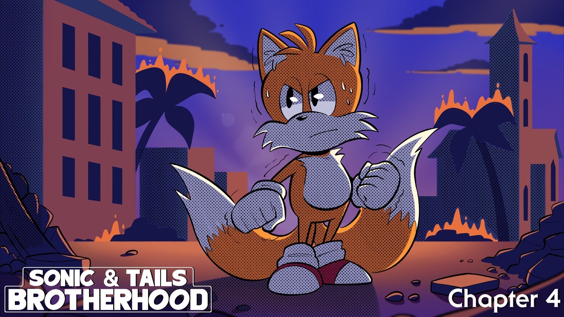 safe40464 artist:lukethecomposer1 miles "tails" prower9852 20261075 abstract background7595 building77 clenched fists745 clouds1091 english text4922 fire383 frown5279 looking offscreen5022 outdoors1961 palm tree262 shivering31 solo18898 sonic and tails: brotherhood4 standing11955 sweatdrop1378 text1208 tree561