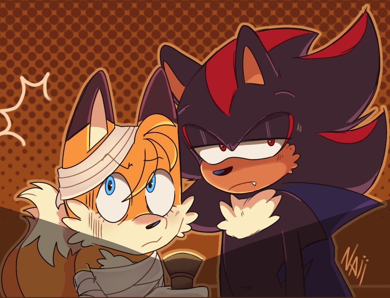 safe34594 artist:iluskonai9 miles "tails" prower8713 shadow the hedgehog5647 20244205 abstract background6743 bandage125 cape298 flashlight11 frown4254 gay4892 halloween82 holding something3001 looking at viewer7387 one fang1228 outline1672 shadow x tails212 shipping9209 signature5730