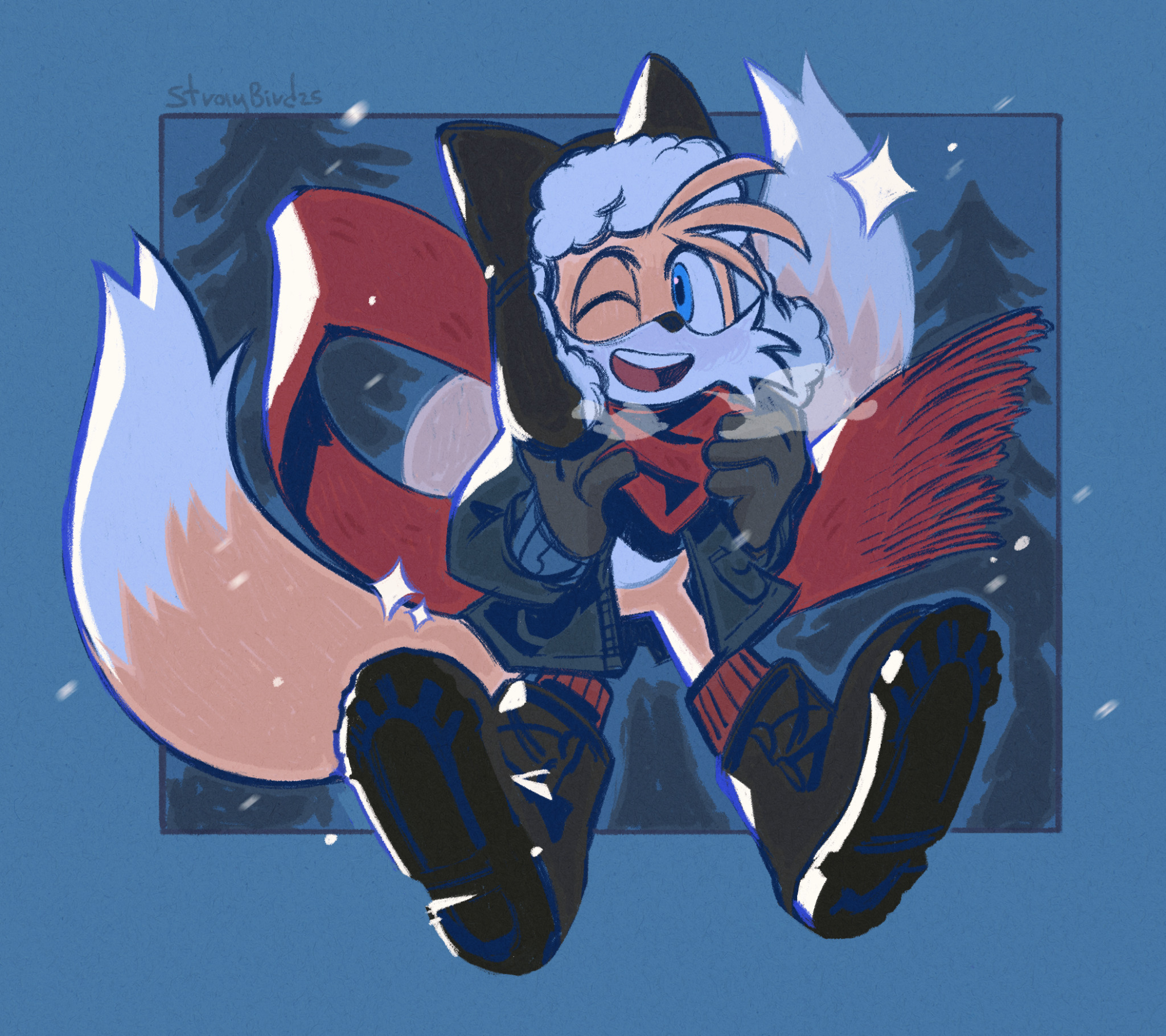 safe34594 artist:straybird2511 miles "tails" prower8713 20252416 alternate outfit929 boots887 brown gloves75 clothes1400 coat99 hat341 looking at viewer7387 mouth open5231 open smile698 scarf464 smile12682 smiling at viewer621 snow128 sparkles952 ushanka hat1 wink1074 winter72 winter outfit98