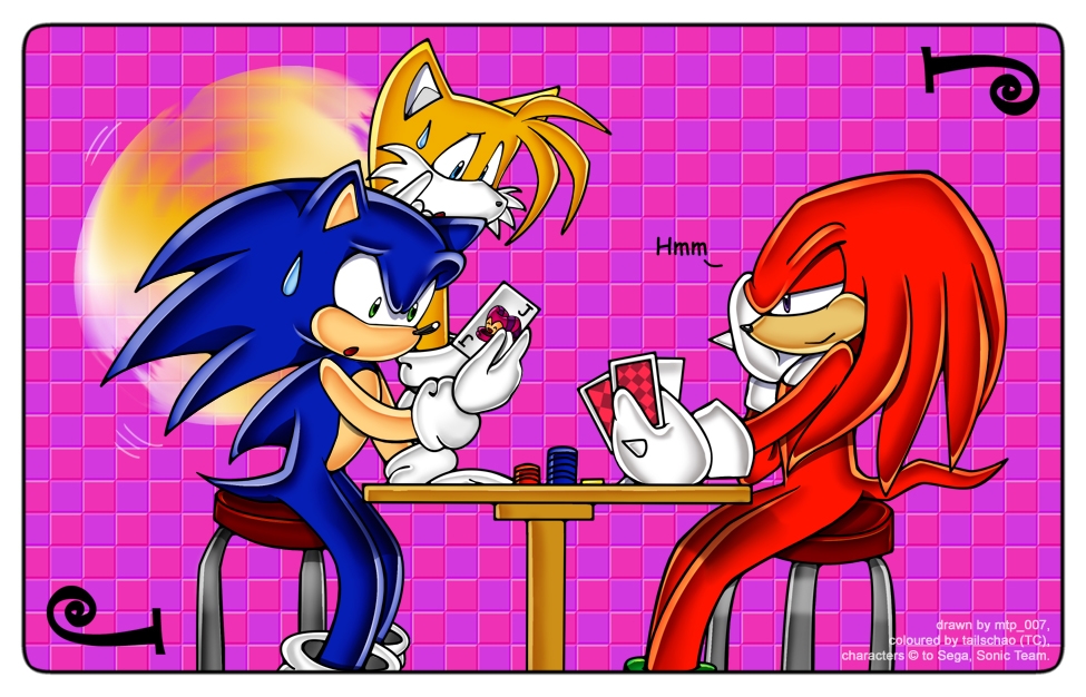 Anyhoo, I drew this not too long ago. Sonic and Knuckles having a card game. I haven't got a clue what game they're playing, but that's okay. Hehe. I added in Tails because I like Sonic and Tails being together in pics, like the oldschool ones. I attempted Sonic Adventure style as far as the faces were concerned, though it doesn't really look like it. Knuckles is winning this time, and poor Sonic seems to have gotten a Joker card that wasn't supposed to be in the deck.