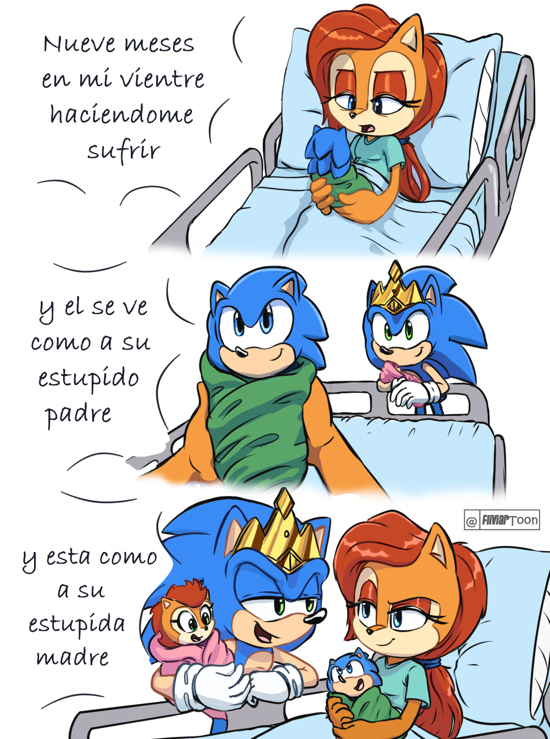 safe35216 artist:fliviartoon12 manik acorn26 sally acorn1134 sonia acorn24 sonic the hedgehog12541 chipmunk435 hedgehog6748 20252675 baby113 carrying them688 comic630 crown88 dialogue2501 nine months in my womb6 ponytail120 quartet64 sally x sonic188 shipping9339 spanish text51 straight1126
