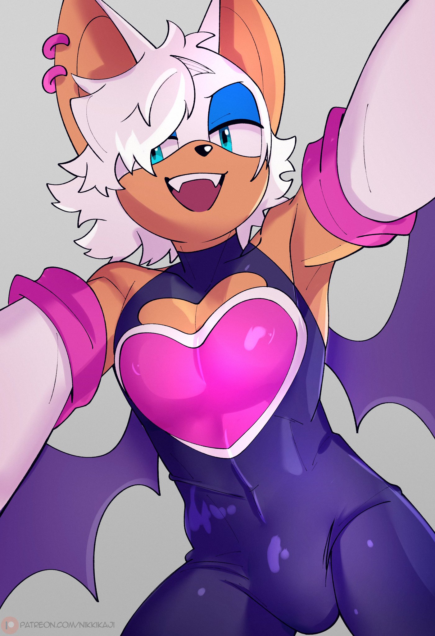 suggestive586 artist:nikkikaji12 rouge the bat1715 bat468 20252832 alternate hairstyle72 bulge85 ear piercing344 earring350 gender swap915 grey background2262 hair over one eye267 lidded eyes3766 looking at viewer7643 mouth open5360 open smile763 simple background14147 smile13115 smiling at viewer764