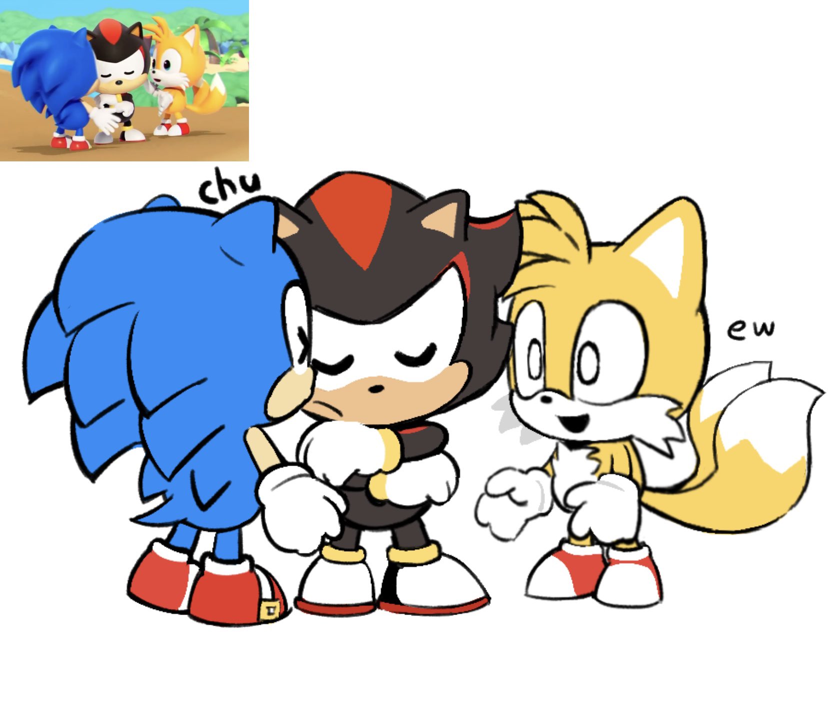 safe36558 artist:zblarush2 miles "tails" prower9049 shadow the hedgehog6065 sonic the hedgehog13235 20253352 chibi201 cute5595 gay5079 kiss1029 looking at them2062 reference inset504 shadow x sonic1730 shipping9660 simple background14888 smile13650 sonic & friends6 standing10463 trio1721 white background7264