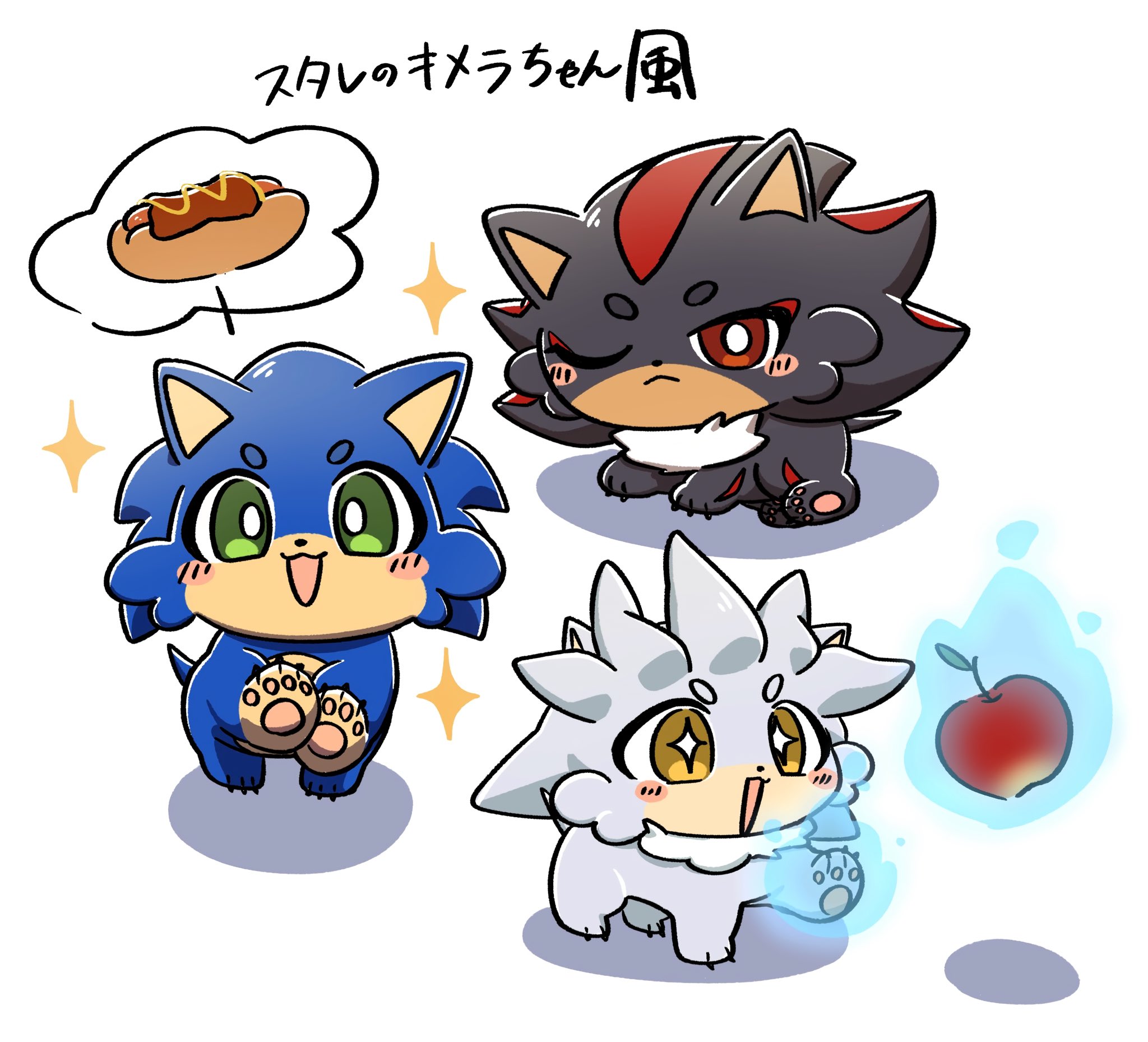 safe36587 artist:oudooooon42748 shadow the hedgehog6071 silver the hedgehog1868 sonic the hedgehog13250 20253356 animalified67 apple39 blushing6459 chili dog136 food415 japanese text395 literal animal232 mouth open5496 one eye closed730 pawpads248 psychokinesis133 simple background14899 smile13661 trio1722 white background7273