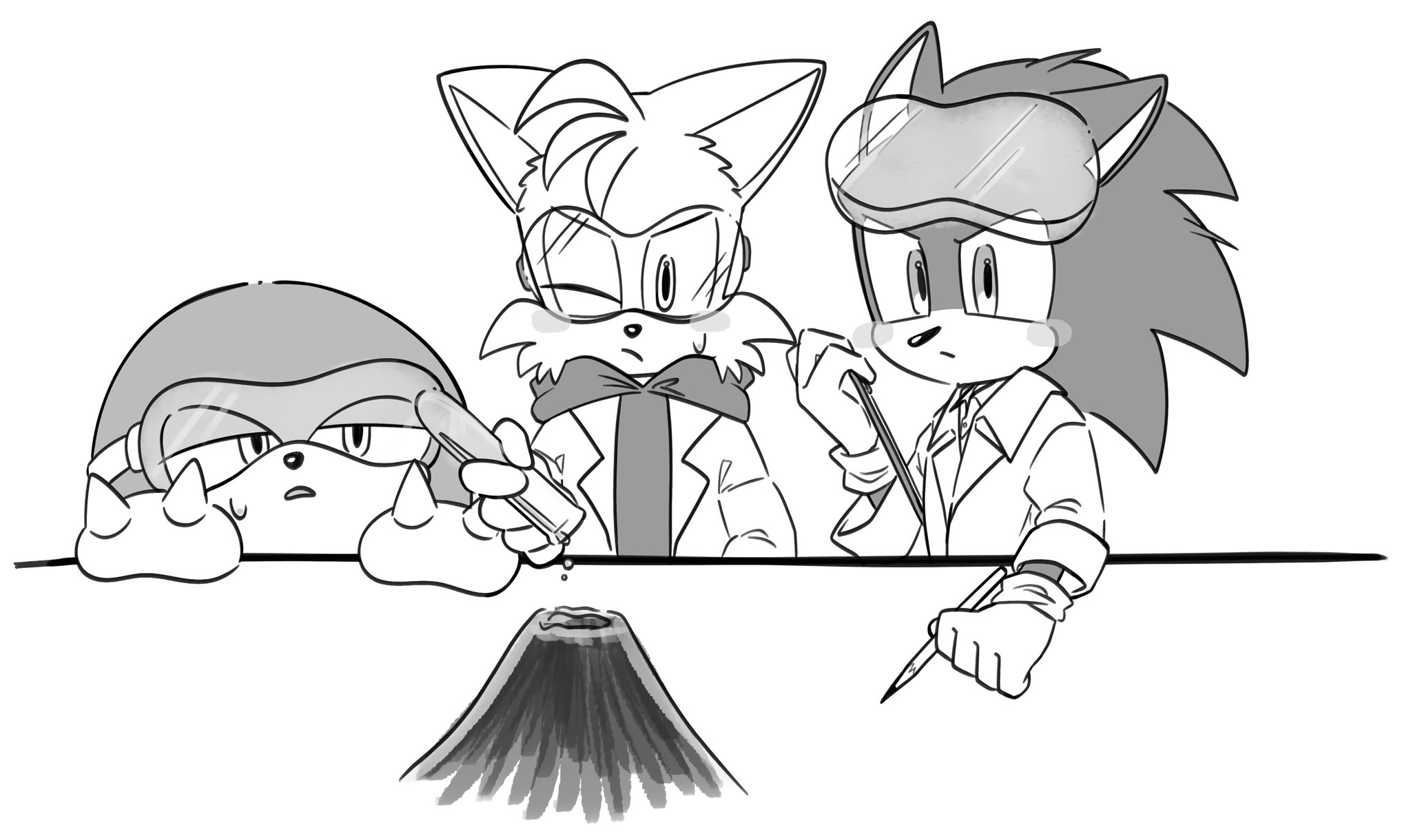 safe36769 artist:oudooooon42795 knuckles the echidna2250 miles "tails" prower9109 sonic the hedgehog13353 echidna775 fox2570 hedgehog7373 20253423 clothes1634 fully clothed192 goggles808 greyscale889 lab coat33 male6467 monochrome2103 redraw1351 simple background14994 test tube2 trio1732 white background7337