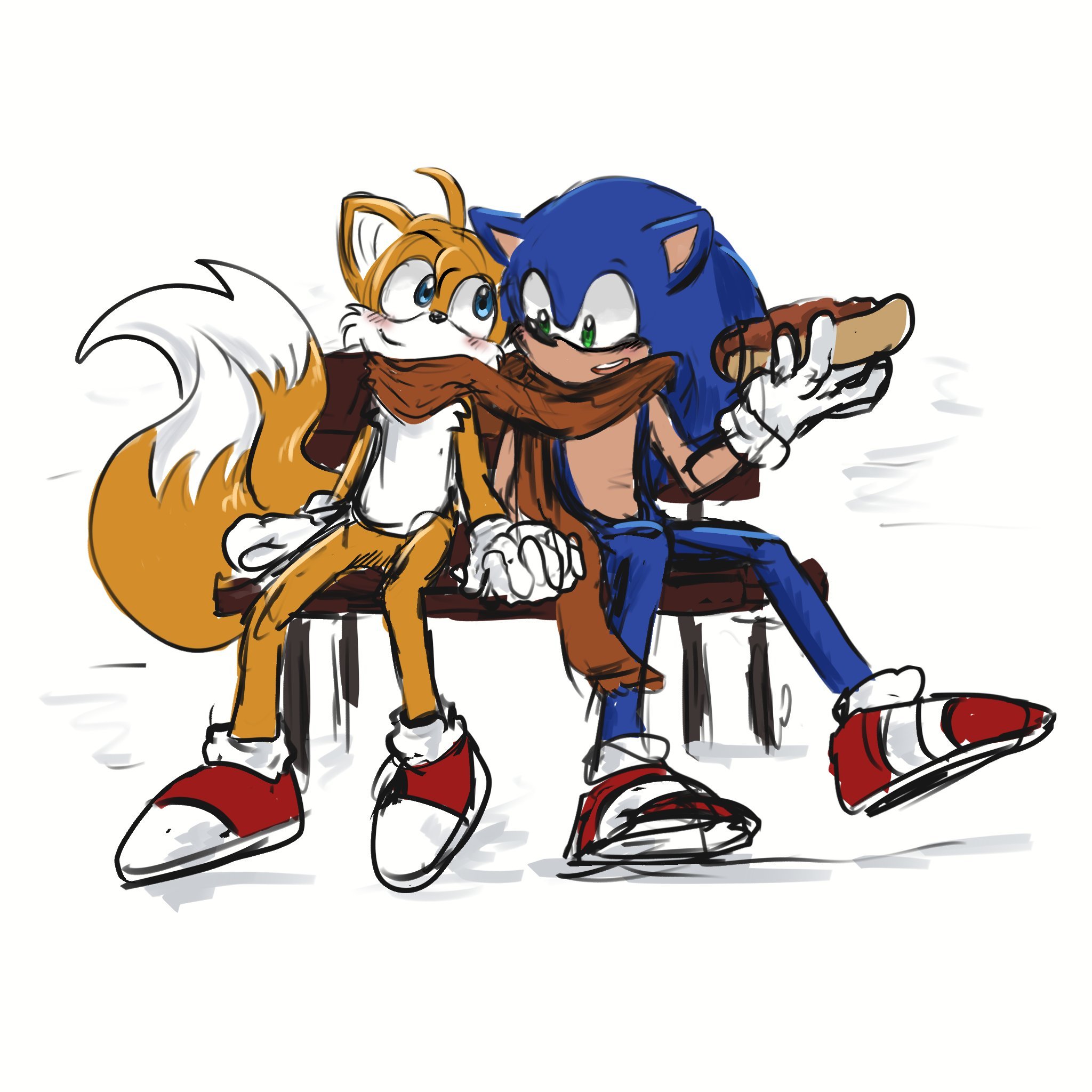 safe36775 artist:hourgliss2 miles "tails" prower9109 sonic the hedgehog13357 20253423 age difference428 bench42 blushing6495 chili dog141 clenched teeth1860 duo12061 food432 gay5109 holding hands1597 holding something3346 scarf533 sharing a scarf19 shipping9722 sitting2223 smile13756 snow165 sonic x tails1242 winter99 winter outfit127