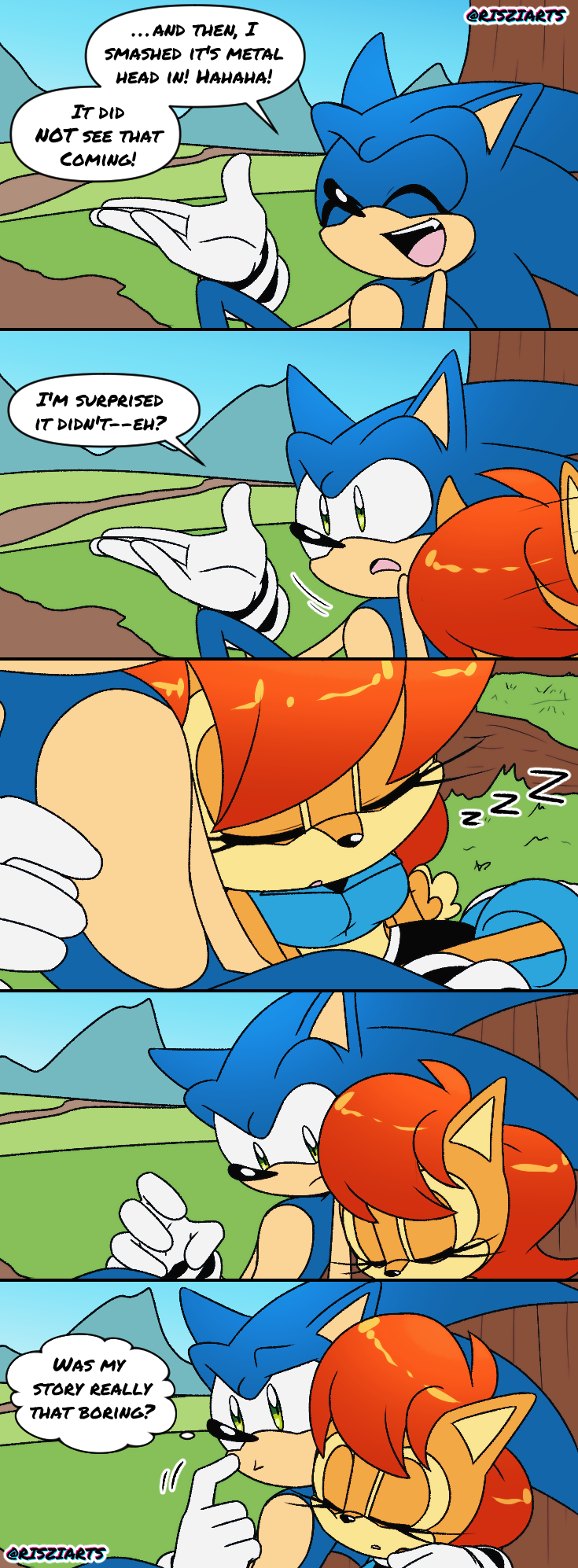 safe36814 artist:risziarts129 sally acorn1276 sonic the hedgehog13387 chipmunk643 hedgehog7383 20244371 comic705 daytime860 dialogue2589 duo12077 english text4196 female6113 leaning on them71 male6474 sally x sonic327 sally's ringblader outfit201 shipping9728 sleeping417 speech bubble1374 straight1387 tree423 under a tree37