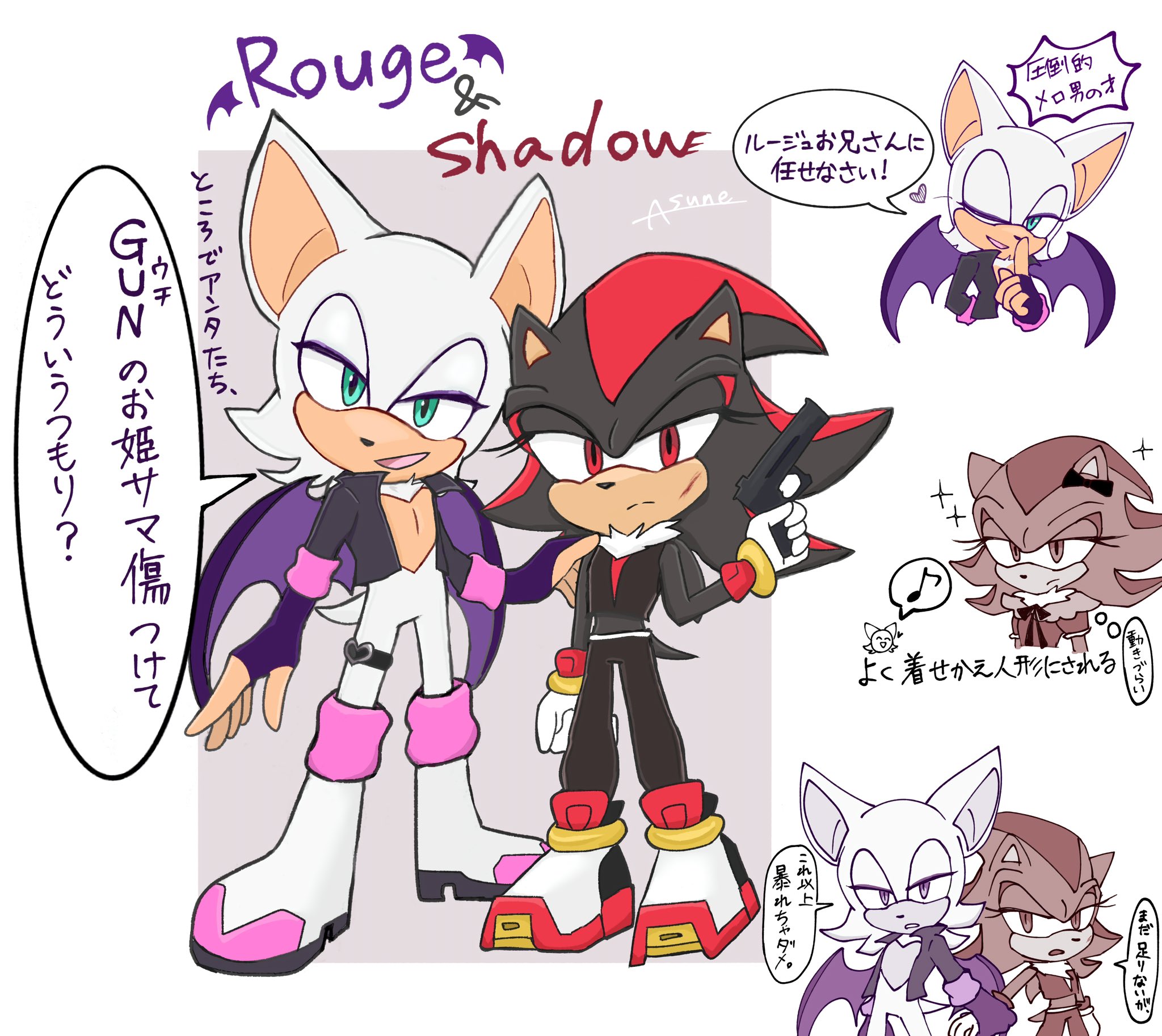safe36987 artist:asune_snare44 rouge the bat1760 shadow the hedgehog6149 20253507 bow200 character name990 duo12175 gender swap937 gun322 holding something3385 japanese text457 lidded eyes3959 simple background15133 smile13855 speech bubble1392 standing10624 white background7403 wink1136