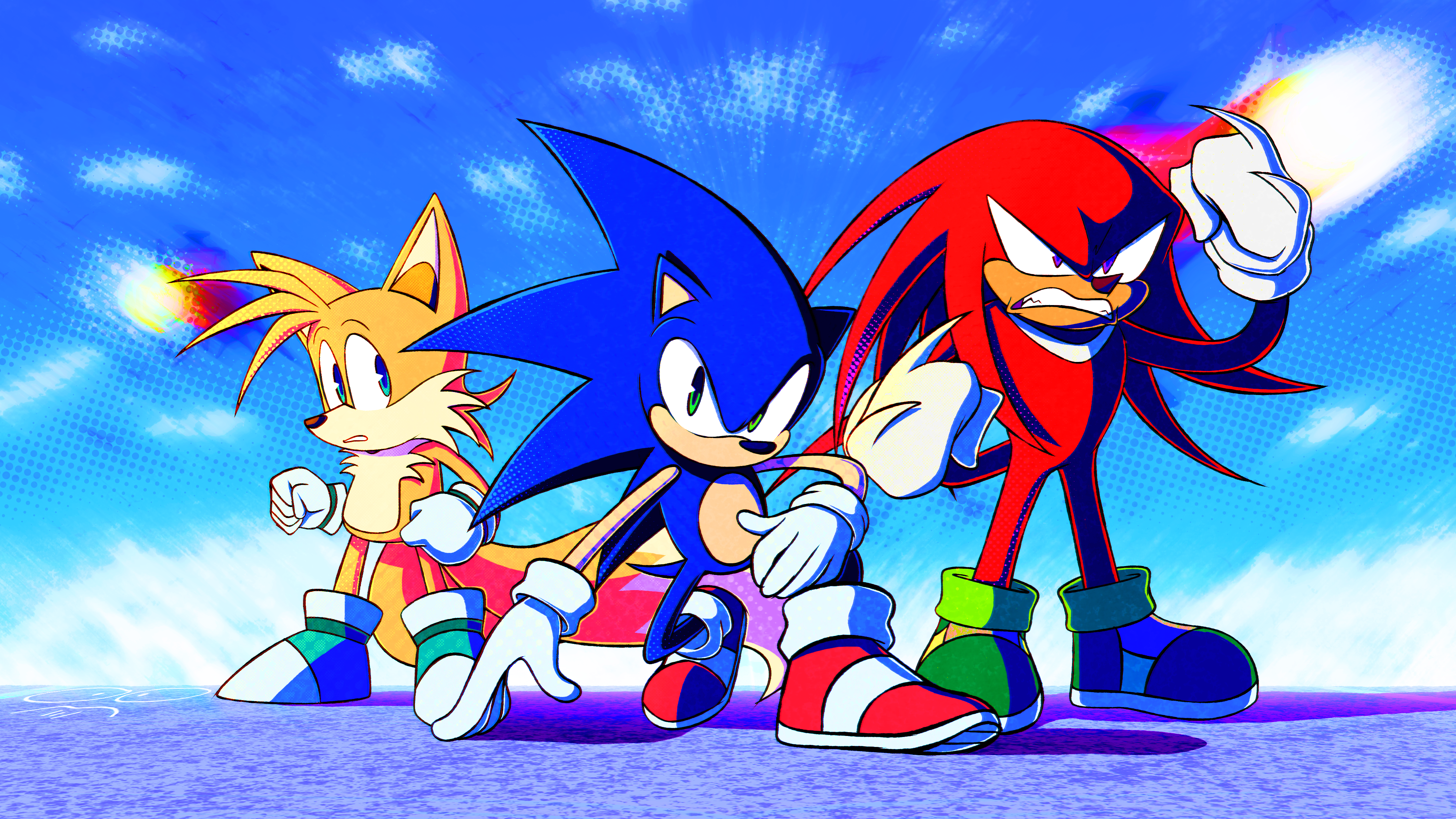 safe36960 artist:endyrendy6 knuckles the echidna2265 miles "tails" prower9166 sonic the hedgehog13459 sonic heroes177 20253485 abstract background7003 alternate outfit1129 alternate shoes71 blue shoes277 clenched fists639 clenched teeth1869 daytime872 egg fleet15 frown4586 hand on ground75 looking at viewer8044 looking offscreen4268 outdoors1556 redraw1355 standing10614 team sonic364 trio1746