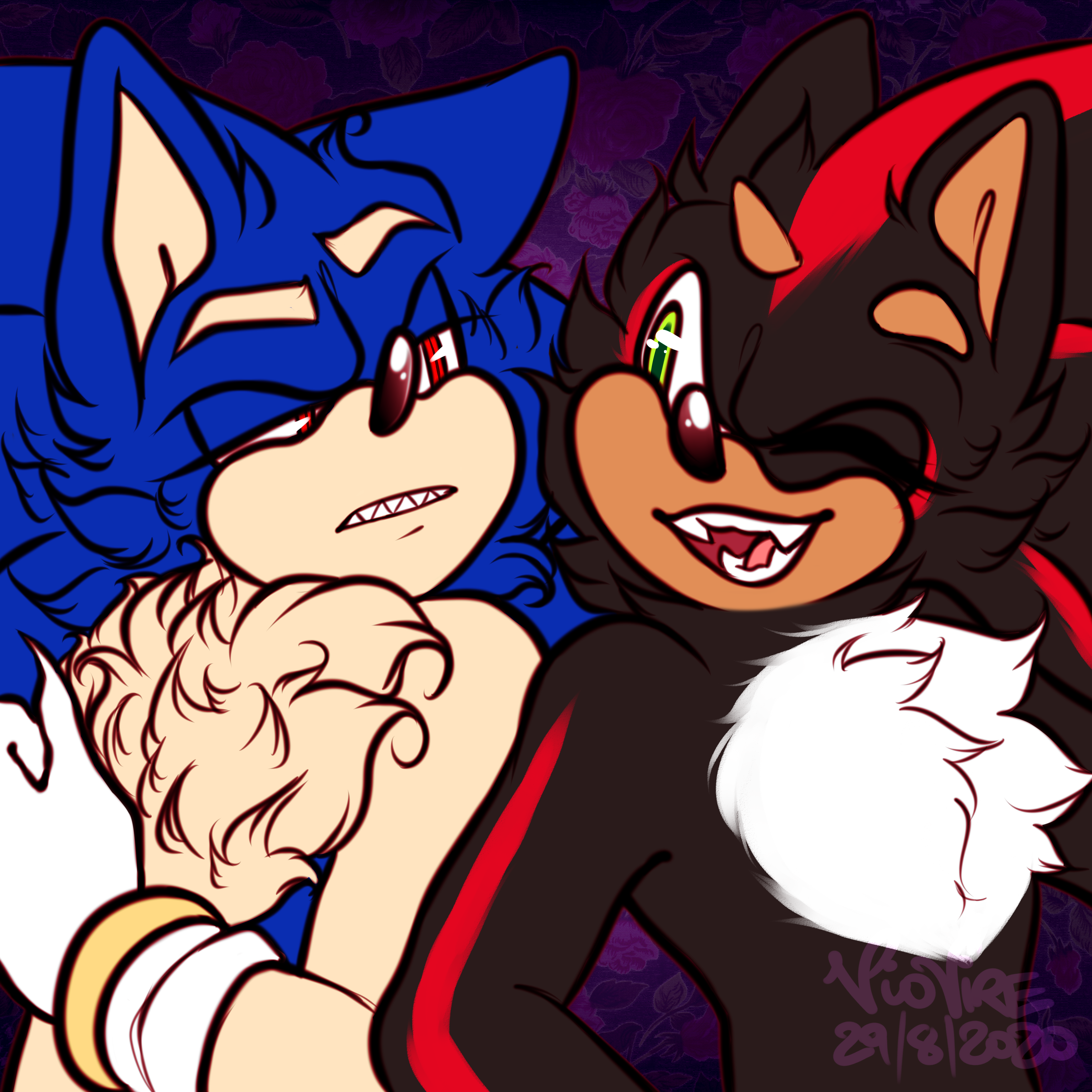 safe36987 artist:velvedd10 shadow the hedgehog6149 sonic the hedgehog13476 20201005 chest fluff764 clenched teeth1869 color swap78 duo12175 ear fluff716 eyelashes1086 flat colors1292 frown4586 lidded eyes3959 looking at each other2681 mouth open5600 sharp teeth328 smile13855 standing10624 wink1136