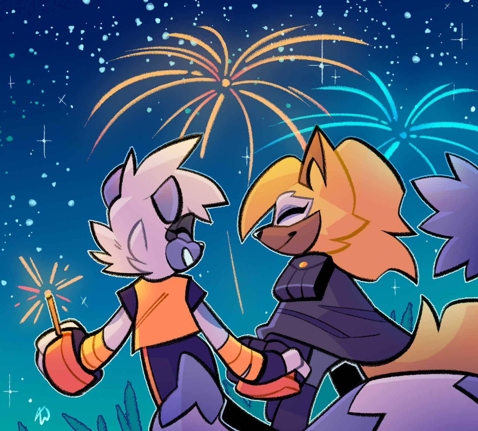 safe37267 artist:mintywhisker9 tangle the lemur1097 whisper the wolf1129 lemur246 wolf407 20201013 abstract background7021 duo12297 eyes closed4680 female6189 fireworks27 holding hands1611 holding something3456 new years46 nighttime506 outdoors1568 outline1799 smile14010 sparkler11 star (sky)454 walking554
