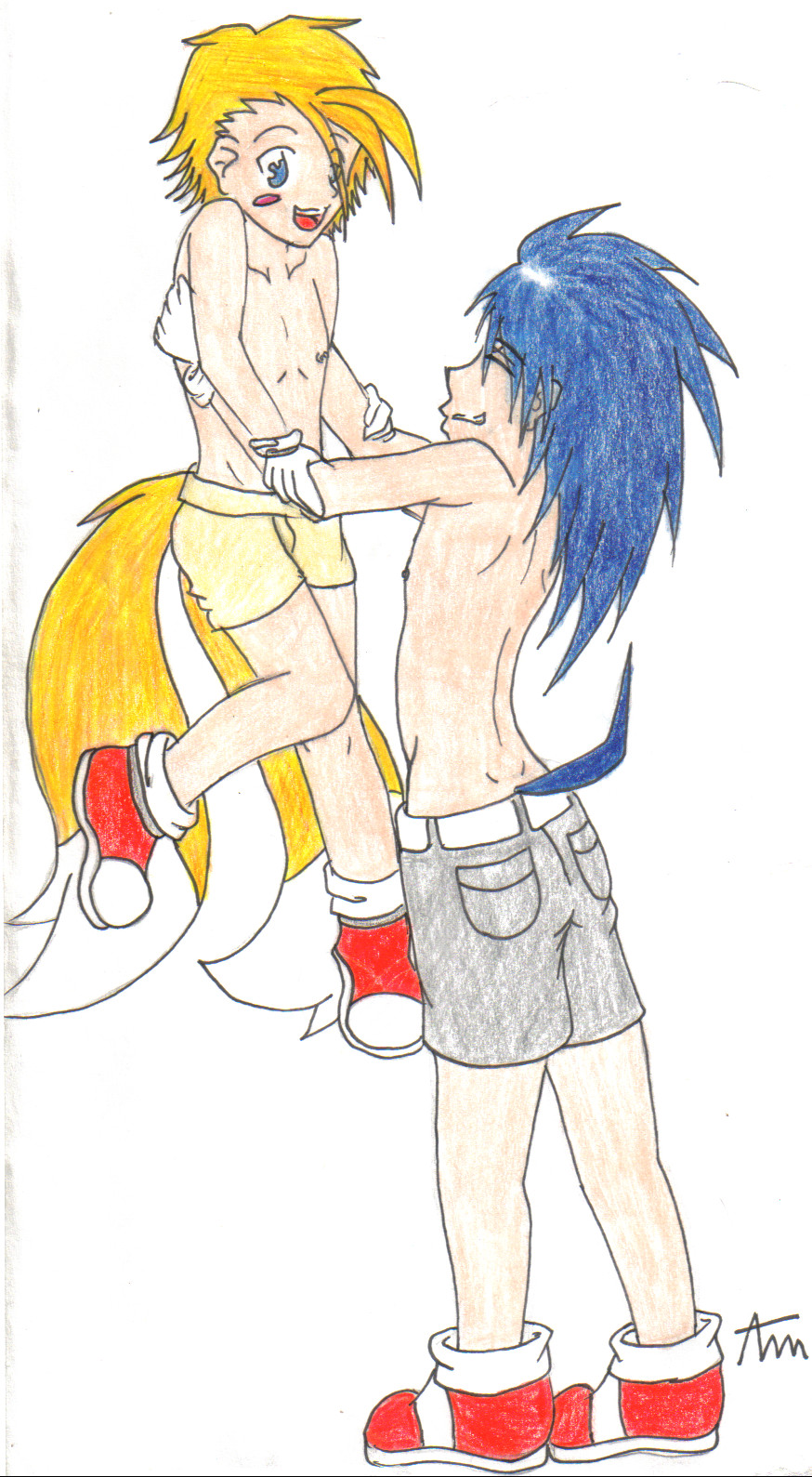 safe37590 artist:andi-chan1 artist:deannie1 miles "tails" prower9283 sonic the hedgehog13711 human2140 200855 age difference488 carrying them762 clothes1730 duo12418 gay5183 humanized770 lifting them30 looking at each other2730 partially humanized286 shipping9916 shorts597 smile14183 sonic x tails1265 species swap237 standing10898 topless42 traditional media1585
