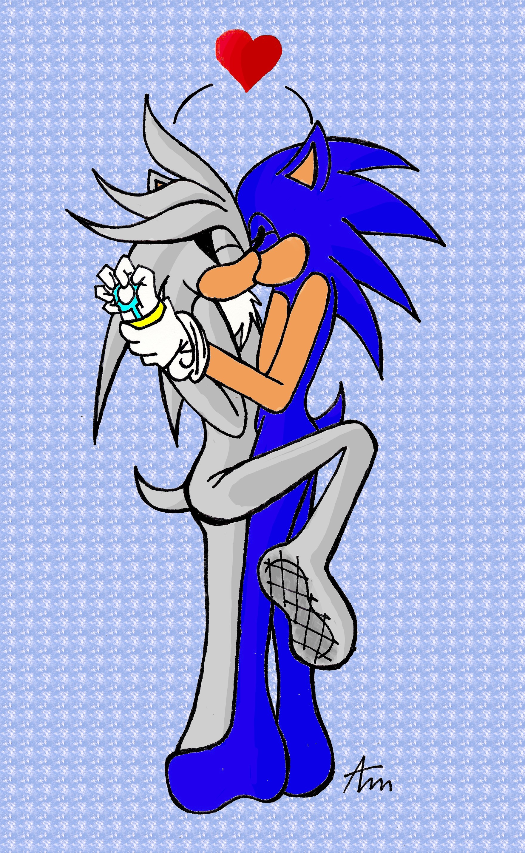 safe37595 artist:sanguinary123774 silver the hedgehog1922 sonic the hedgehog13711 200855 barefoot478 duo12422 eyes closed4713 flat colors1354 gay5183 heart3235 holding them994 kiss1081 male6688 shipping9919 signature6143 silver10 silver x sonic118 sonic10 standing10898