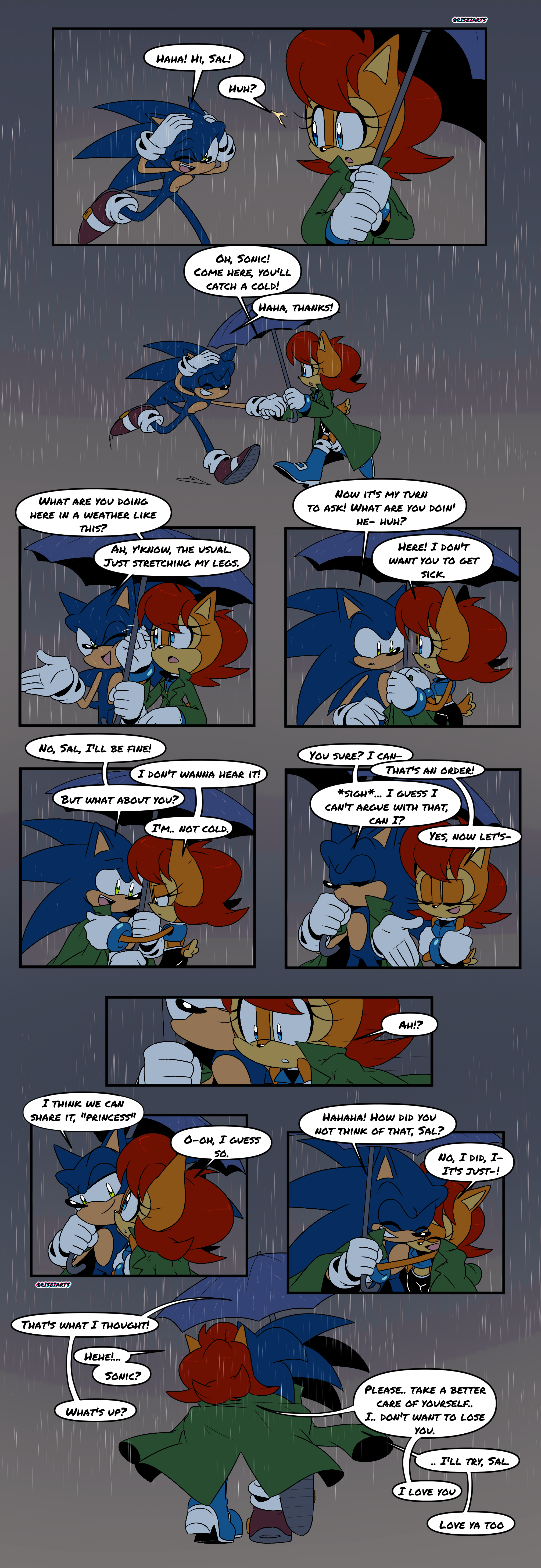 safe37821 artist:risziarts141 sally acorn1347 sonic the hedgehog13810 chipmunk712 hedgehog7588 20232618 comic798 dialogue2668 duo12552 english text4344 female6411 jacket1078 male6774 rain130 running637 sally x sonic374 sally's ringblader outfit218 shipping10021 speech bubble1518 straight1540 umbrella76 walking564