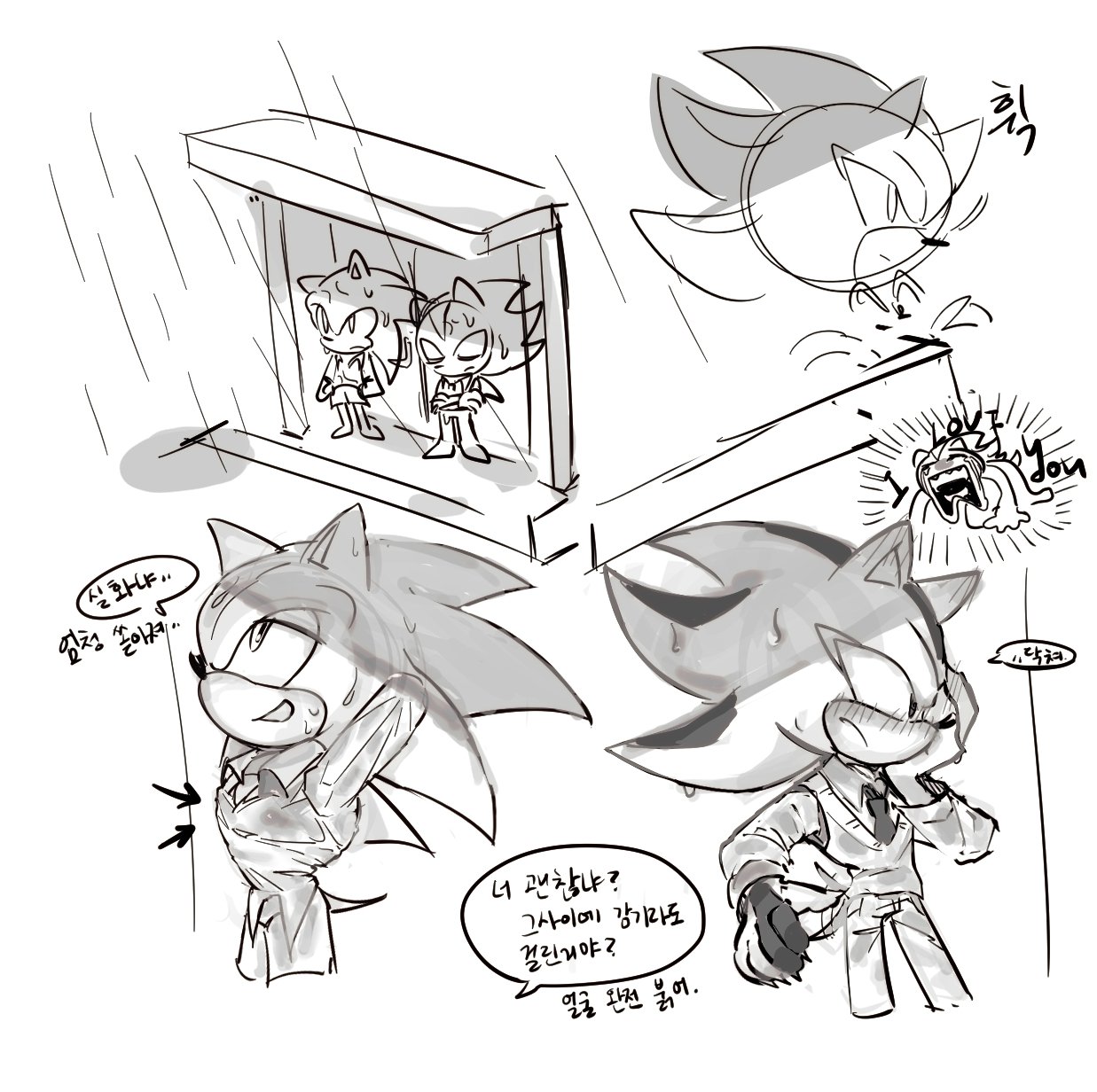 safe37821 artist:tamjeong_sonic370 shadow the hedgehog6389 sonic the hedgehog13810 20253832 alternate universe876 au:school1 blushing6687 duo12552 fully clothed222 gay5219 greyscale983 korean text287 monochrome2271 pants541 rain130 school uniform28 shadow x sonic1795 shipping10021 shirt765 simple background15620 sketch1865 smile14252 speech bubble1518 standing10980 water462 wet55 white background7696