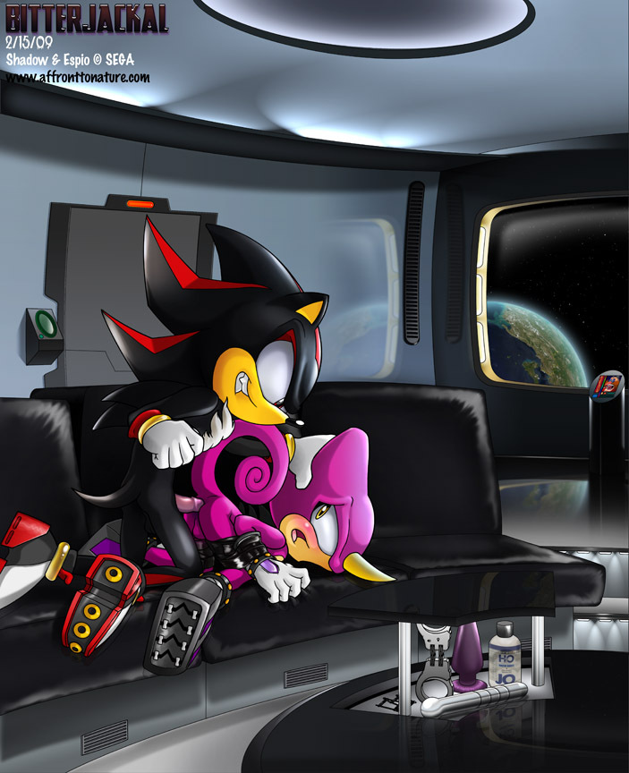This is a VERY belated birthday gift for Lilshock I've been working on since September. Building this pic was quite the adventure, the characters were hand drawn but everything else was constructed in Illustrator (a first for me), and colored in Photoshop. Overall I'm pretty happy with the outcome, and may do some more of the "cel" style shading in the future. There were a few other things I wanted to do with reflections and such, as some of them aren't quite correct, but this was eating so much time those few little details would probably have gone unnoticed. And no, Shadow's not going to do him dry…he's just being a bastard and taunting>;) Look for a near duplicate of this picture in the next few days with Espio being a little shy about the whole situation… (For anyone commenting, could you let me know if this appears too dark on your screens, as I'm using a new iMac to color on and I think it's a bit bright. Thanks!)