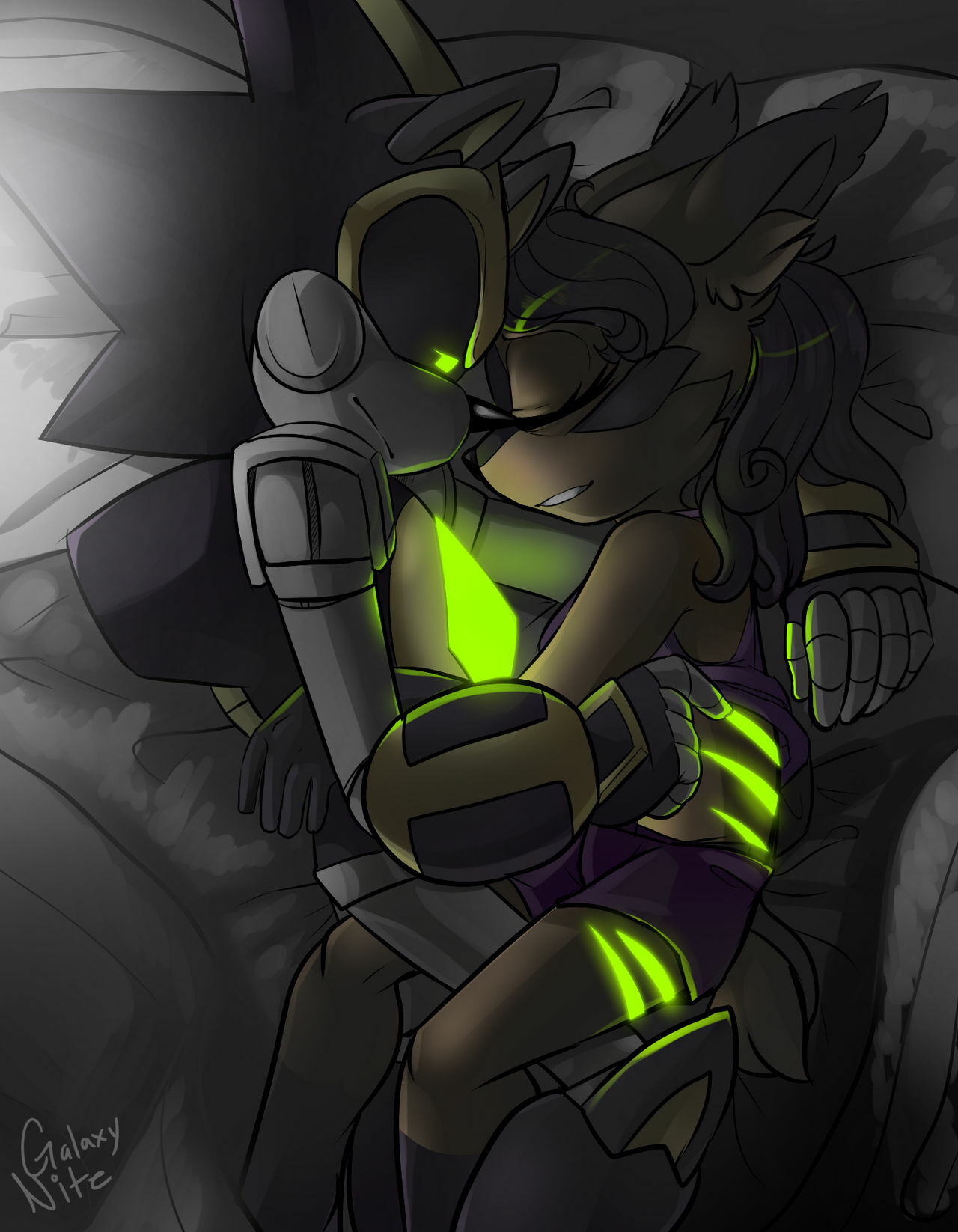 safe38430 artist:galaxynite21 nicole the hololynx365 shard the metal75 lynx130 2016311 alternate outfit1327 bed332 clothes1864 duo12934 female6820 glowing132 glowing eyes502 hugging1290 lying on bed4 male7032 nighttime549 robot1082 shipping10275 shorts610 sleeping442 straight1694