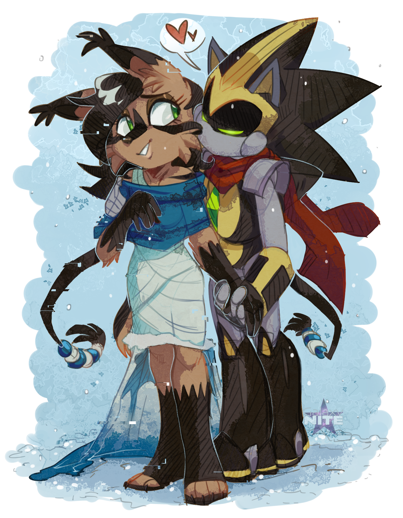 safe38430 artist:galaxynite21 nicole the hololynx365 shard the metal75 lynx130 2018648 alternate outfit1327 clothes1864 daytime981 dress810 duo12934 female6820 hand on another's shoulder47 heart3342 holding hands1656 kiss1114 kiss on cheek437 male7032 nicole x shard35 robot1082 scarf572 shipping10275 snow177 snowing92 straight1694 walking581