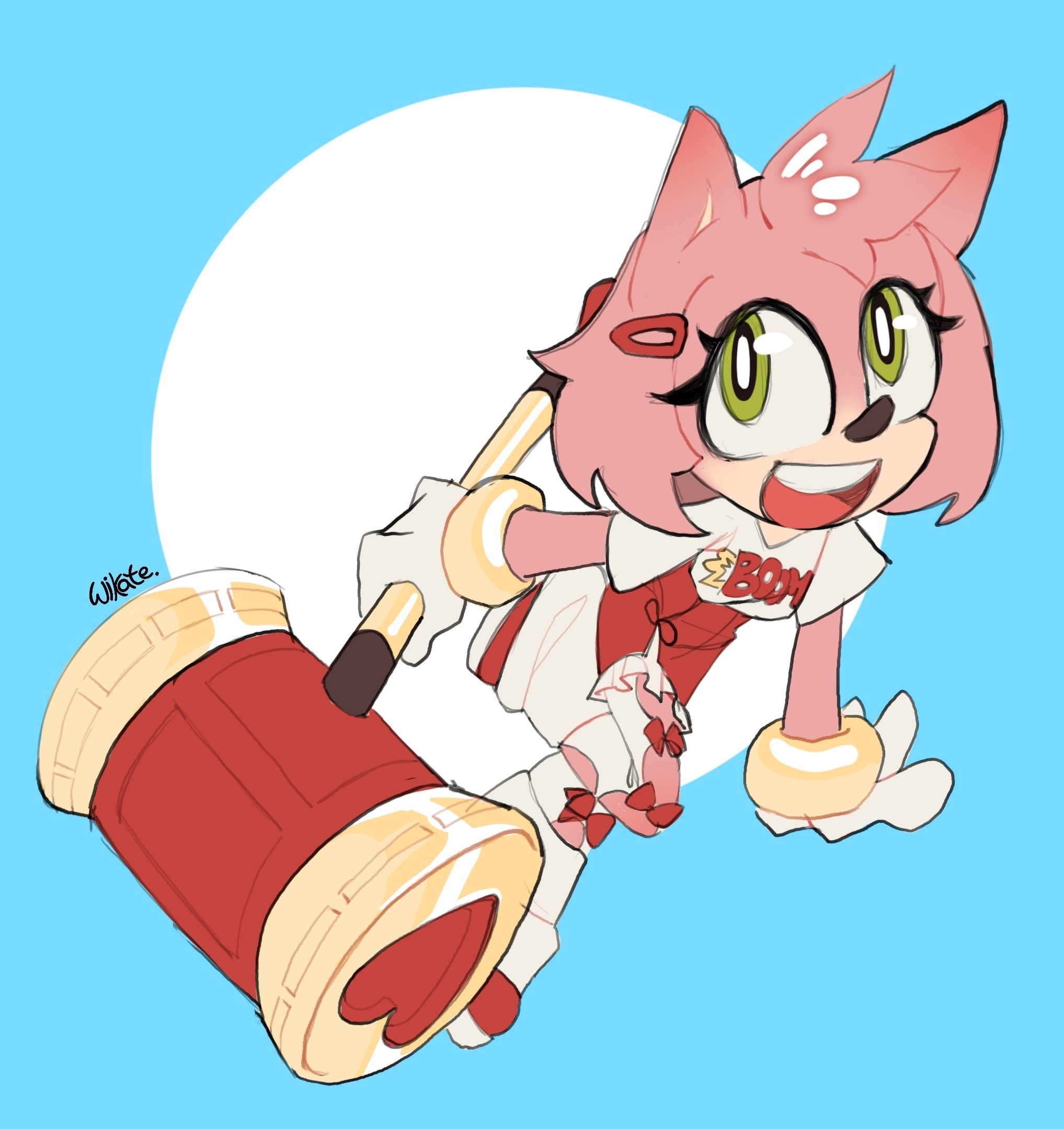 safe38632 artist:w1kate3 amy rose5928 20244524 bow219 clothes1878 eyelashes1207 hair clip3 holding something3804 looking at viewer8620 mouth open6058 open smile1056 pants566 piko piko hammer506 redesign884 shirt783 signature6239 smile14776 solo17665 words on a shirt53