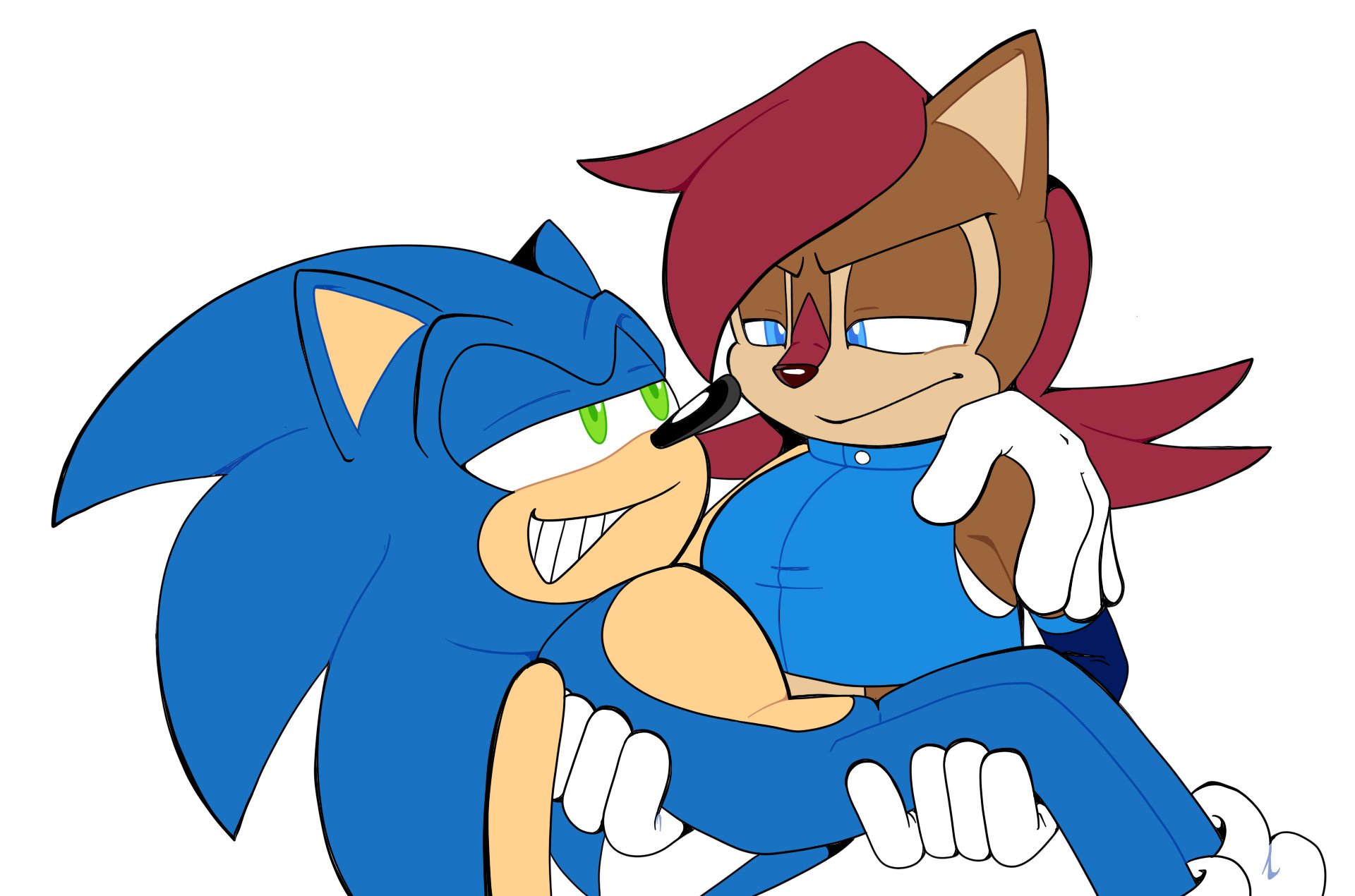 safe39285 artist:tvict10121 sally acorn1669 sonic the hedgehog14485 chipmunk1049 hedgehog8063 2021887 alternate universe954 carrying them834 duo13434 female7142 grin577 looking at each other2932 male7260 not amused1 sally x sonic573 sally's ringblader outfit355 shipping10622 simple background16647 straight1900 white background8184