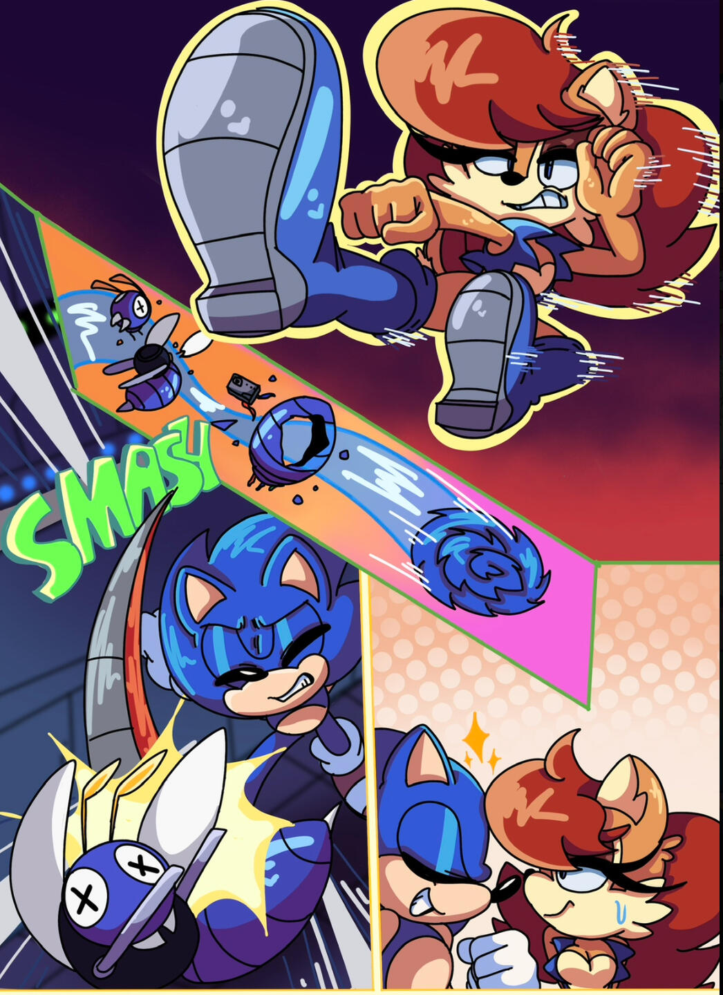 safe39328 artist:maliahboon3 sally acorn1693 sonic the hedgehog14513 chipmunk1071 hedgehog8081 2026697 badnik114 comic880 destroyed robot7 duo13466 english text4645 eyes closed5005 female7173 fighting26 kicking53 male7287 robot1137 sally x sonic592 sally's vest and boots301 shipping10652 sparkles1087 straight1926 sweatdrop1265