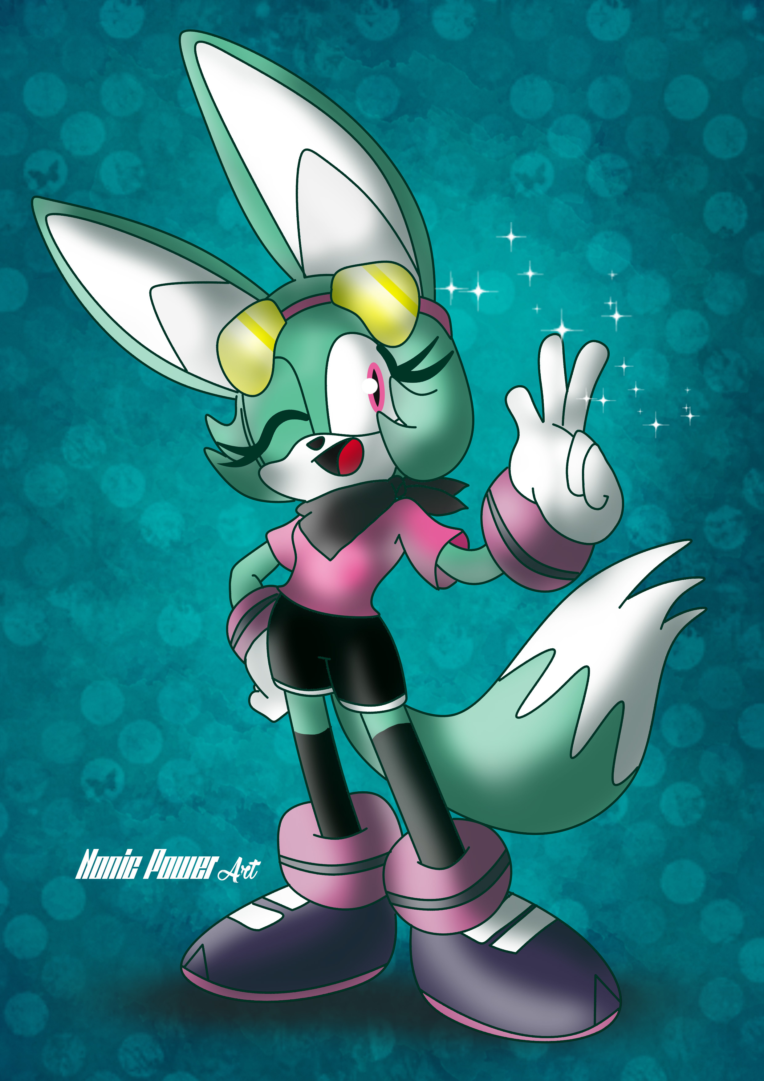safe39424 artist:nonicpower63 sonar the fennec27 20232743 abstract background7392 female7220 fennec184 hand on hip1102 looking at viewer9031 mouth open6394 open smile1272 signature6389 smile15412 solo18182 solo female422 sparkles1092 standing11544 v sign1132 wink1238