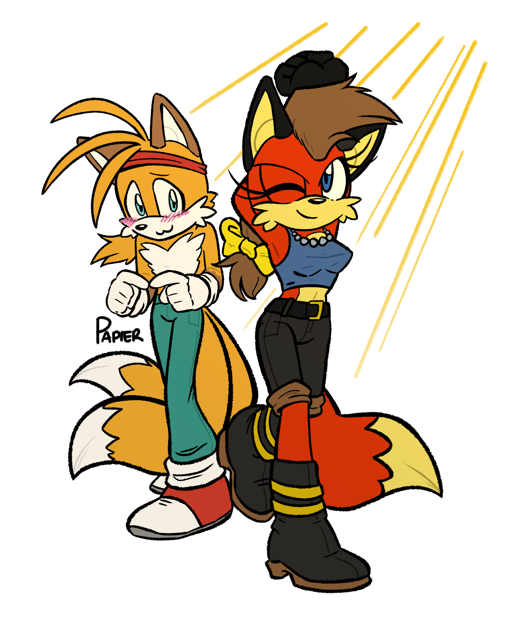 safe39425 artist:tracingpapier15 fiona fox182 miles "tails" prower9594 fox2709 20221537 :3221 arms behind head50 blank background20 blushing7070 clothes2004 duo13504 female7221 fiona x tails25 hand behind head99 looking at viewer9034 male7359 necklace166 one eye closed785 pants593 pose190 shipping10677 standing on one leg421 straight1940
