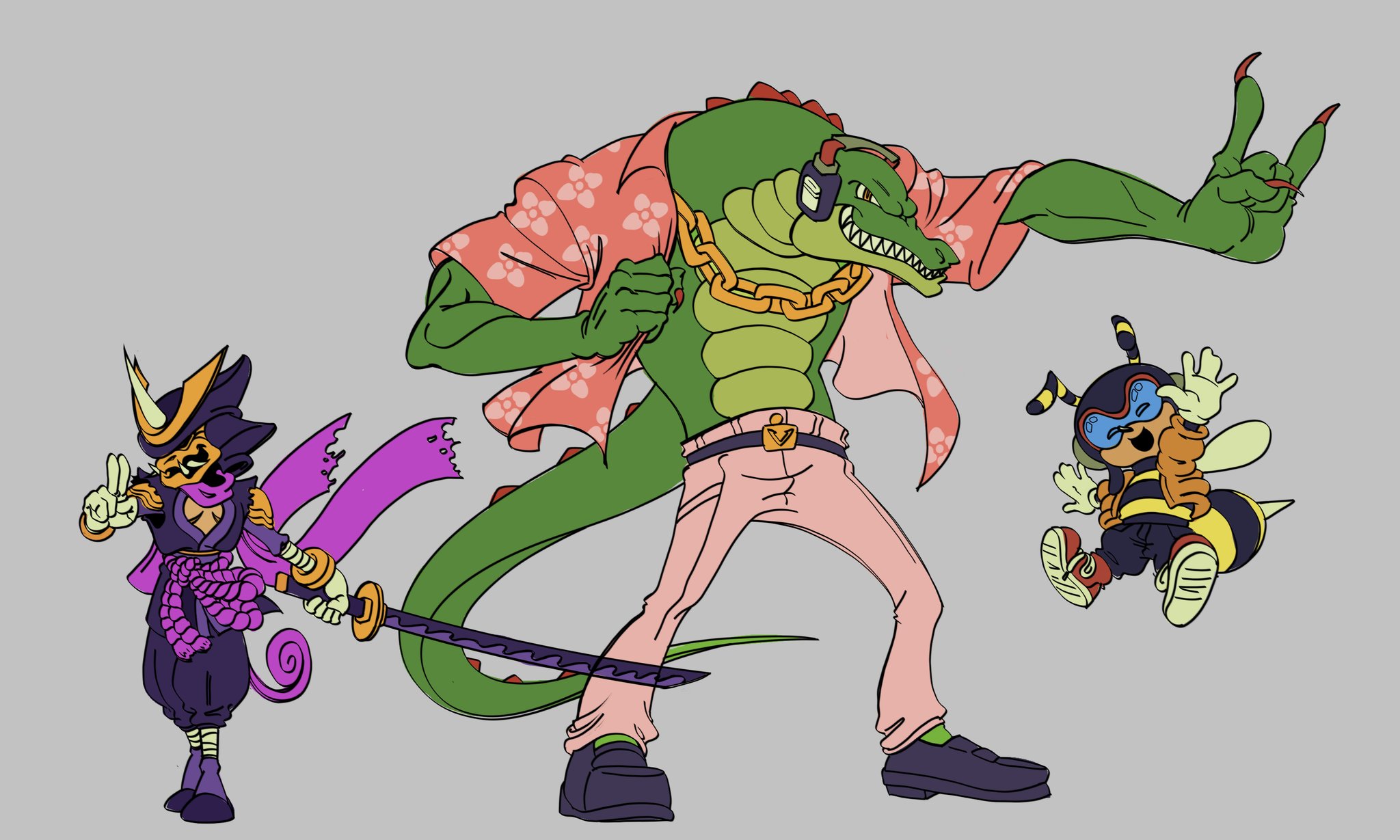safe39608 artist:thecorderra1 charmy bee488 espio the chameleon828 vector the crocodile315 bee199 crocodile84 2026785 alternate outfit1473 belt458 chameleon227 chaotix case files7 claws551 clenched fist763 clothes2026 coat136 devil horns (gesture)117 eyes closed5044 flat colors1523 flying1354 gloves1821 goggles887 grey background2622 holding something4066 jacket1127 japanese clothes56 katana18 looking offscreen4747 male7512 mid-air895 mouth open6456 ninja outfit12 pants595 pilot hat49 posing489 redesign925 scarf610 shoes1376 simple background16820 smile15553 standing11626 team chaotix106 top surgery scars684 trans boy espio7 trans male943 transgender1649 treads311 trio1950 weapon212