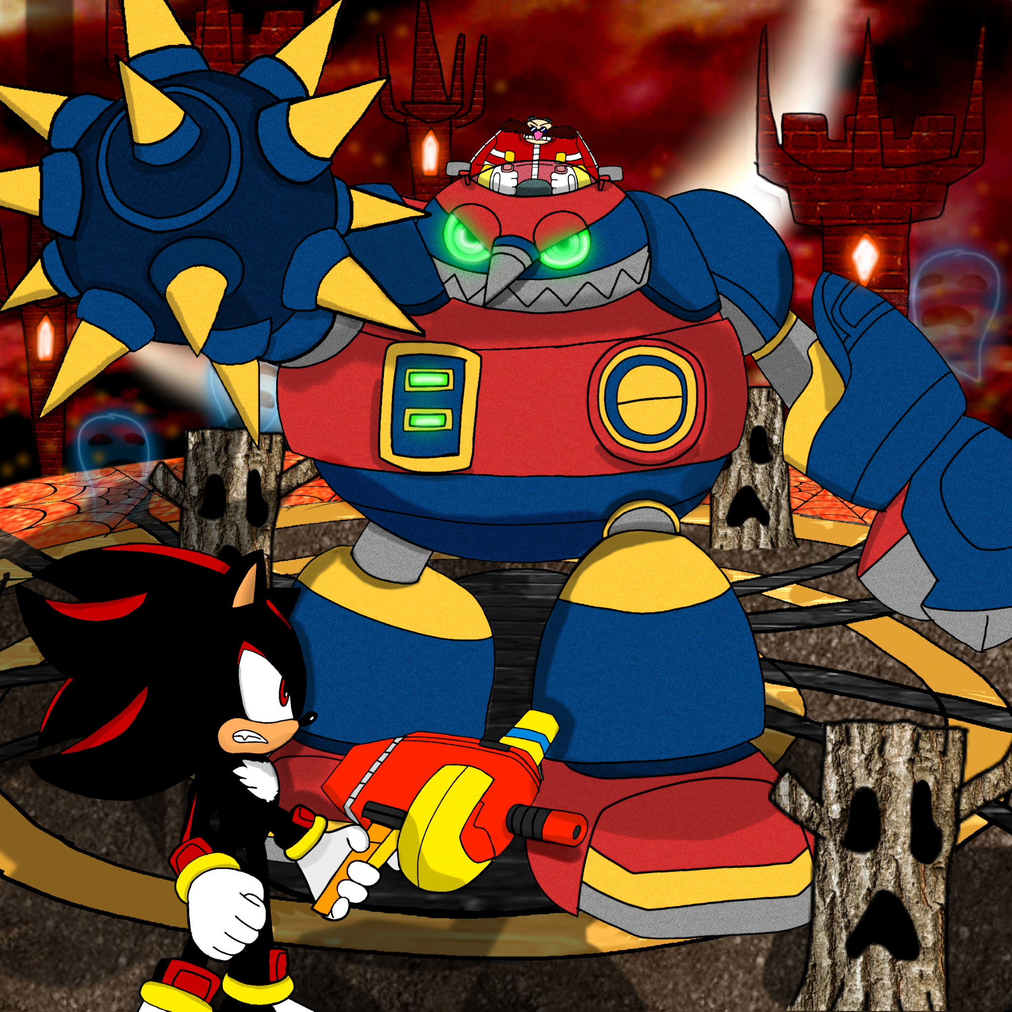 safe39676 artist:egg-emperor1 robotnik764 shadow the hedgehog6753 human2274 20254261 abstract background7413 blaster29 clenched teeth2018 cryptic castle4 duo13622 egg breaker2 fight172 glowing eyes515 holding something4076 looking at each other2981 male7558 mechsuit3 red sky26 robot1144 shadow the hedgehog (video game)149 standing11642 weapon216
