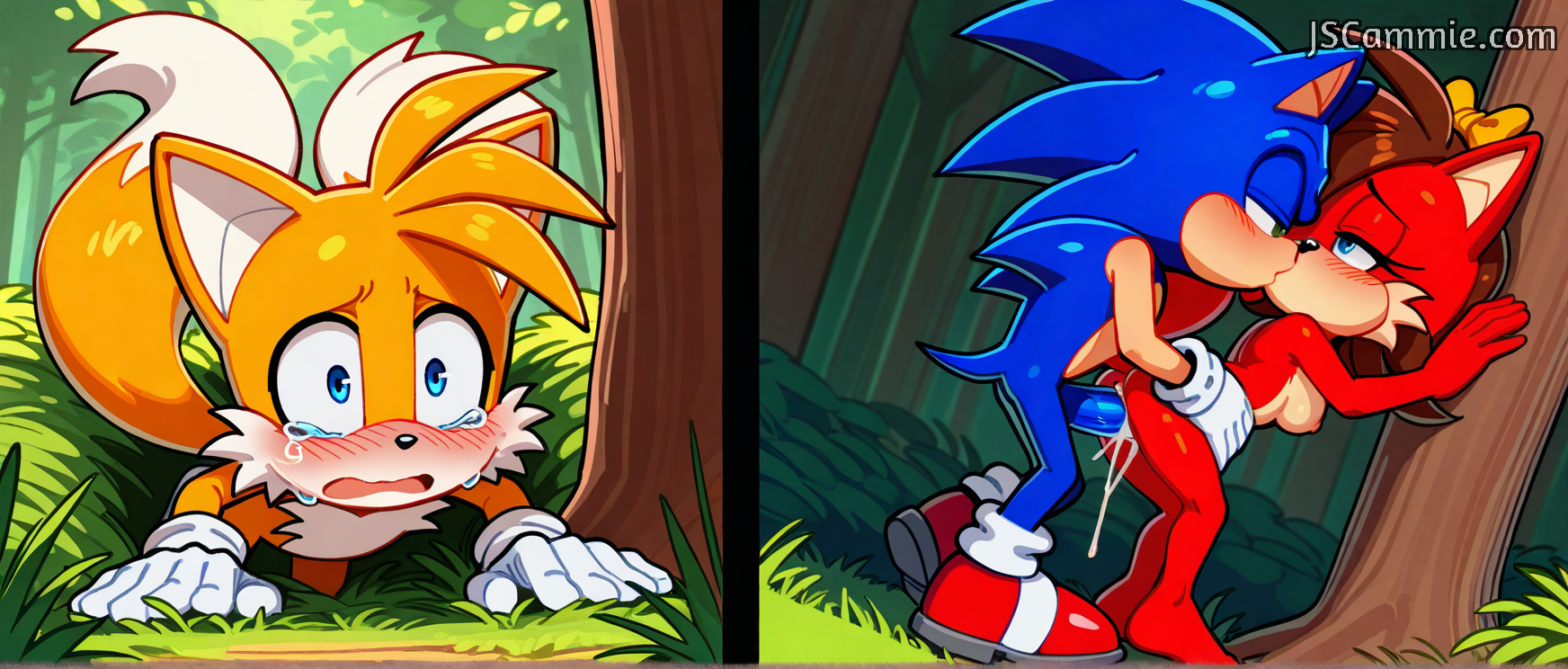 Prompt: (ultra-detailed), masterpiece, nsfw, (wamudraws style), dynamic pose, split screen, dynamic angle, sonic (series), full body view, forest background, bushes, <rp> leftside of the sceen ((1boy, male, tails_the_fox, looking through bushes, in bushes, watching, crying, shocked, blushing, sad, crying, cuckhold, cuck, <rp> ,1girl, fox, Fiona the Fox, sonic (series), 1girl, blue eyes, brown hair, medium hair, red fur, yellow fur, two-tone fur, yellow bow on head, combed hair, ((1boy, male, sonic the hedgehog,)) standing, tree, against tree, standing sex, standing doggystyle, vaginal intercourse, plap, huge penis, blue balls, blue cock, kissing, netorare, ntr, cum,