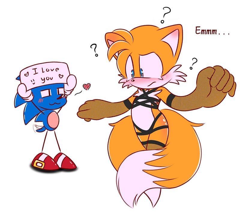 suggestive687 artist:jhoycookie22 miles "tails" prower9820 sonic the hedgehog14930 20254417 :3238 confused53 dialogue2987 duo14061 english text4897 gay5581 heart3607 holding something4316 question mark451 shipping11092 sign47 simple background17378 sonic x tails1403 standing11915 stick figure25 text1180 wagging tail426 white background8543