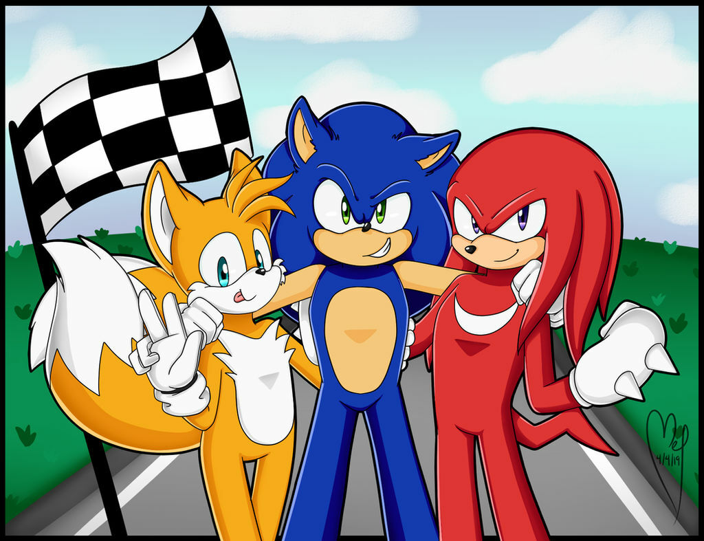 safe40464 artist:melancholybat9 knuckles the echidna2476 miles "tails" prower9852 sonic the hedgehog14966 echidna884 fox2868 hedgehog8686 2019812 abstract background7595 arm around shoulders306 checkered flag6 clouds1091 daytime1204 flag499 grass915 looking at viewer9553 male8008 outdoors1961 smile16229 standing11955 team sonic406 tongue out970 trio2016 v sign1187