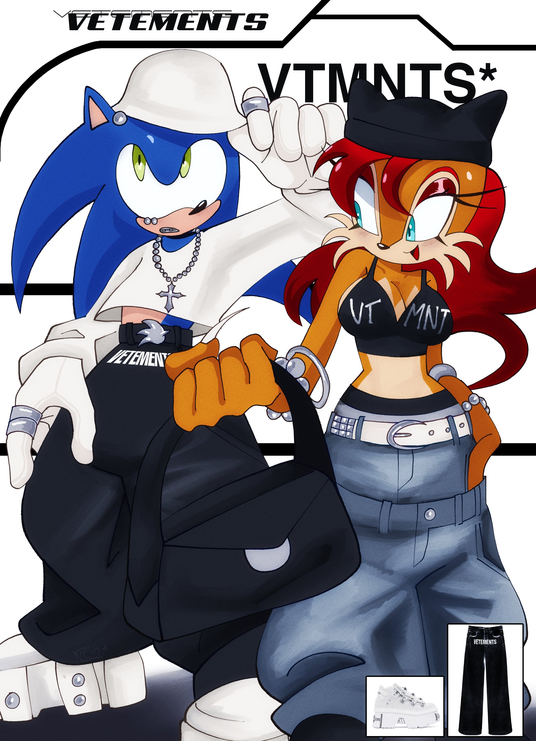 safe40586 artist:xtc_0o3 sally acorn1897 sonic the hedgehog15031 chipmunk1306 hedgehog8744 20261119 alternate outfit1570 bag181 baggy pants1 bracelet103 clothes2210 duo14191 english text4949 female7787 hat540 holding something4417 long hair81 looking at viewer9680 male8077 necklace180 pants642 piercing87 ring (jewelry)48 sally x sonic724 shipping11184 shirt844 straight2202 vetements (company)1