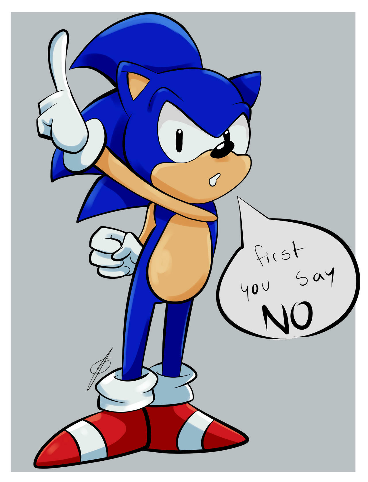 safe40719 artist:nunninaa2 sonic the hedgehog15094 hedgehog8778 adventures of sonic the hedgehog182 20201109 border647 clenched fist827 dialogue3041 english text4980 grey background2745 looking at viewer9775 male8145 pointing1369 redraw1480 signature6633 simple background17739 solo19172 sonic says14 speech bubble1884 standing12050 talking298 text1270 that's no good1