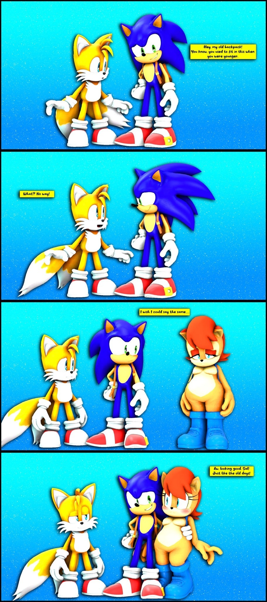 safe40790 artist:pixelrush11 miles "tails" prower9962 sally acorn1951 sonic the hedgehog15131 chipmunk1364 fox2912 hedgehog8814 20232889 3d1486 bag183 blender21 blue background783 blushing7452 carrying something15 comic920 dialogue3056 english text4999 fat sally acorn7 female7921 male8224 positivity26 sally's vest and boots375 simple background17819 speech bubble1900 trio2038