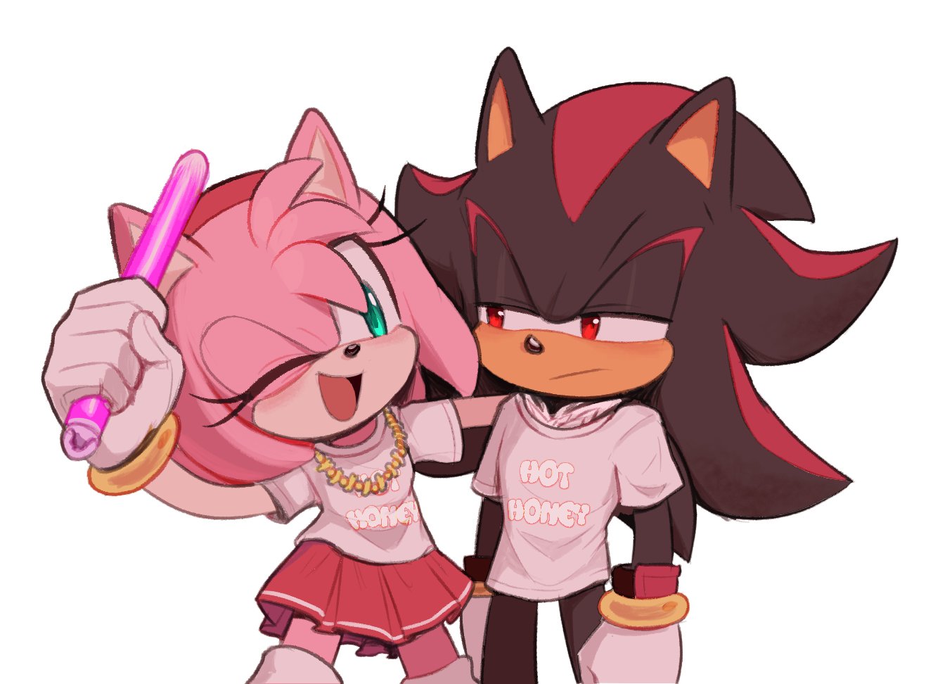 safe40865 artist:toonsite18 amy rose6207 shadow the hedgehog6938 hedgehog8906 20232890 amy x shadow106 clothes2259 duo14349 english text5021 female7969 glowstick3 hand on another's shoulder53 holding something4488 looking at each other3132 male8262 necklace186 shipping11292 shirt849 simple background17850 skirt519 straight2272 white background8770 wink1327