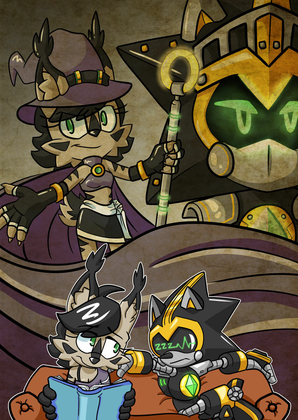 safe40936 artist:bohemianlizardking3 nicole the hololynx437 shard the metal105 lynx202 2018748 book136 duo14401 female8028 holding something4511 knight armor80 looking at them2559 looking at viewer9873 male8310 nicole x shard63 robot1195 shipping11328 sitting2840 sleeping481 sofa45 straight2303 witch outfit17 zzz124